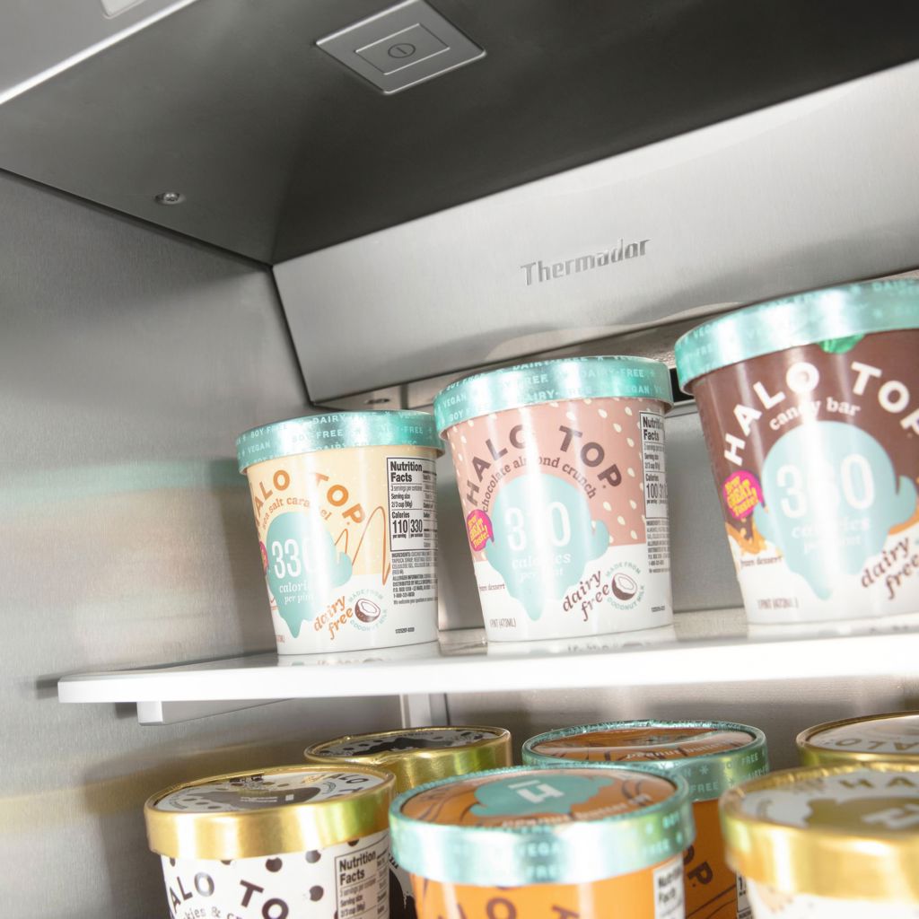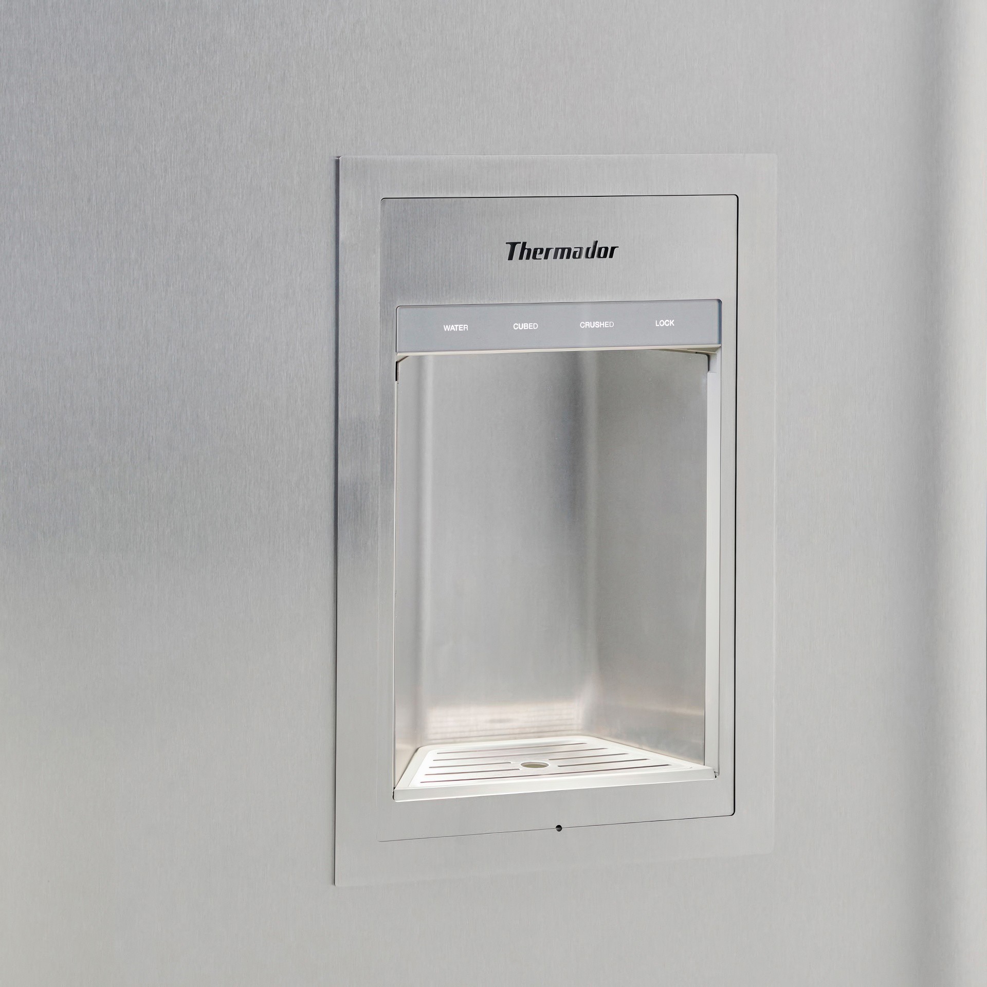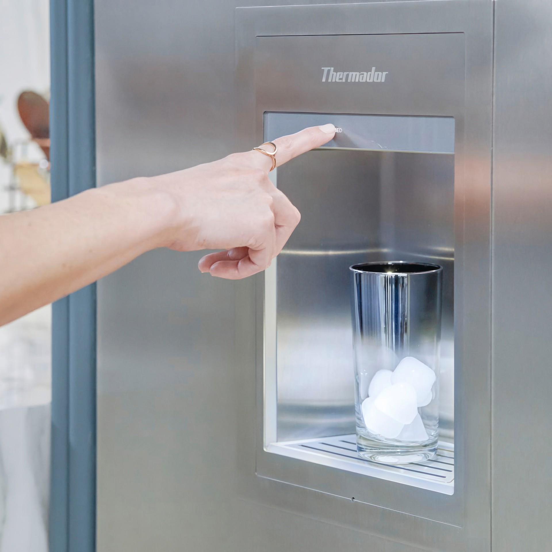 Il est plus facile que jamais de se servir un verre d’eau avec des glaçons grâce au distributeur de glaçons et d’eau Thermador intégré dans la porte, doté de commandes tactiles intuitives et merveilleusement bien éclairé.