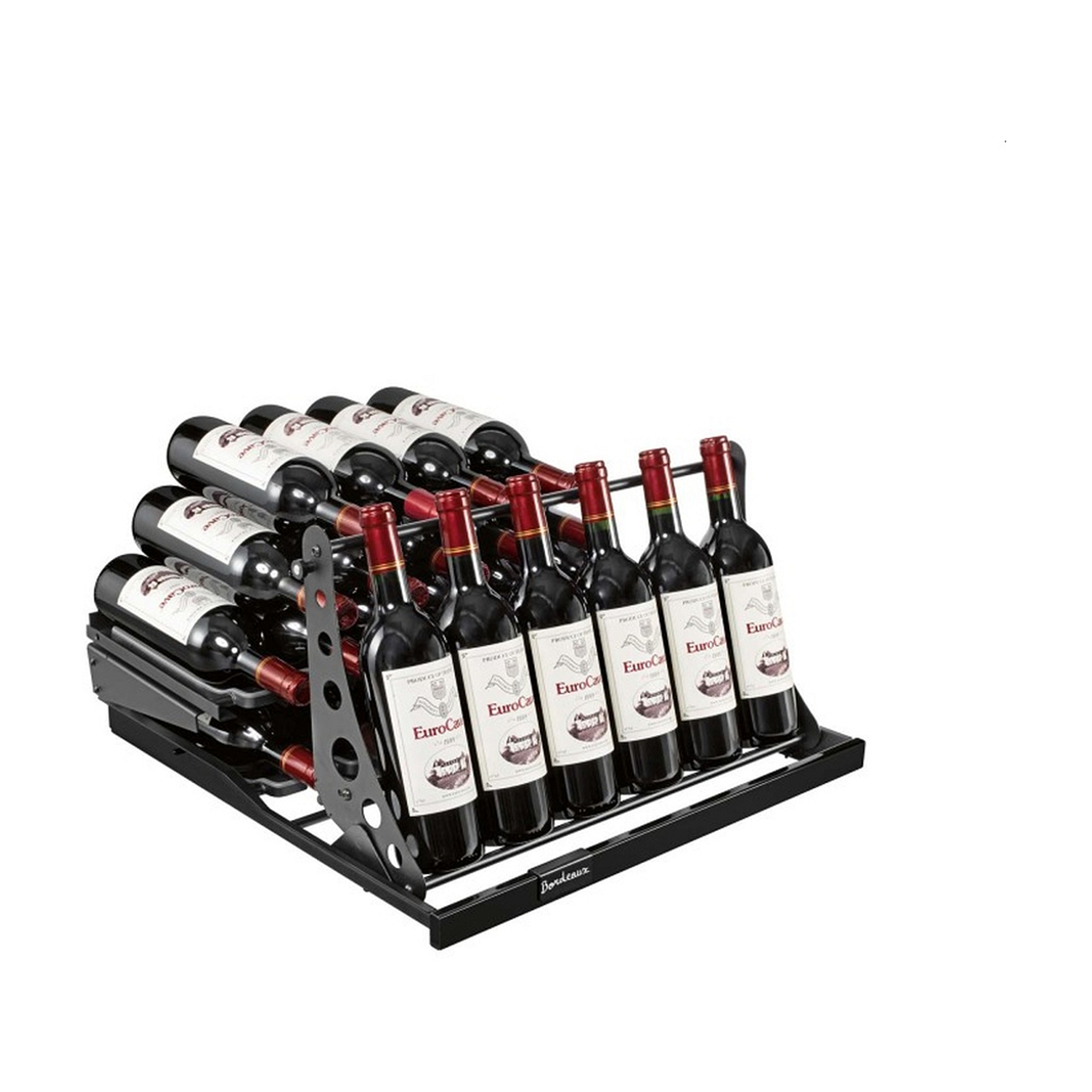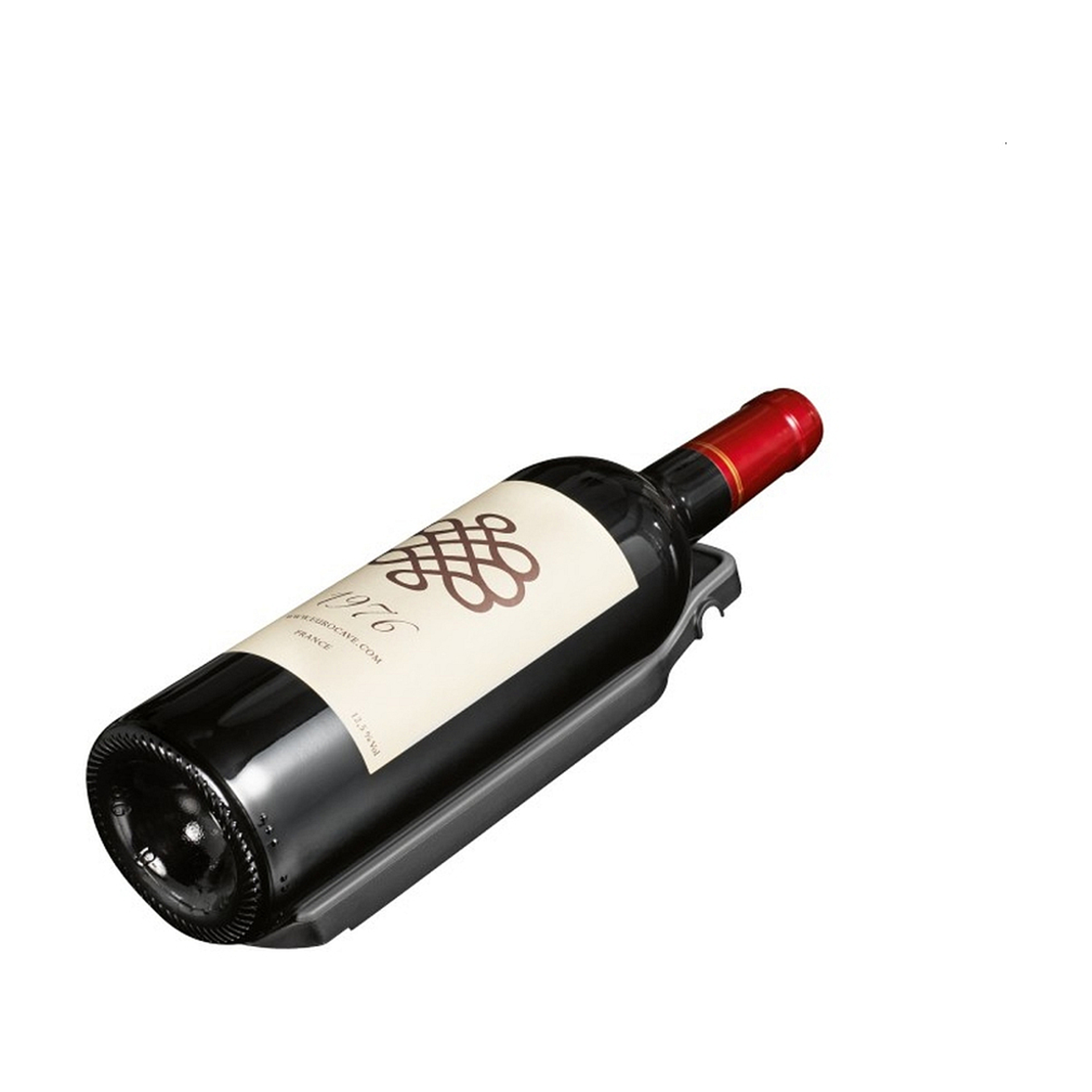 Les évidements de la demi-étagère de rangement sont universels et peuvent accueillir des bouteilles alsaciennes, bourguignonnes traditionnelles et bordelaises .