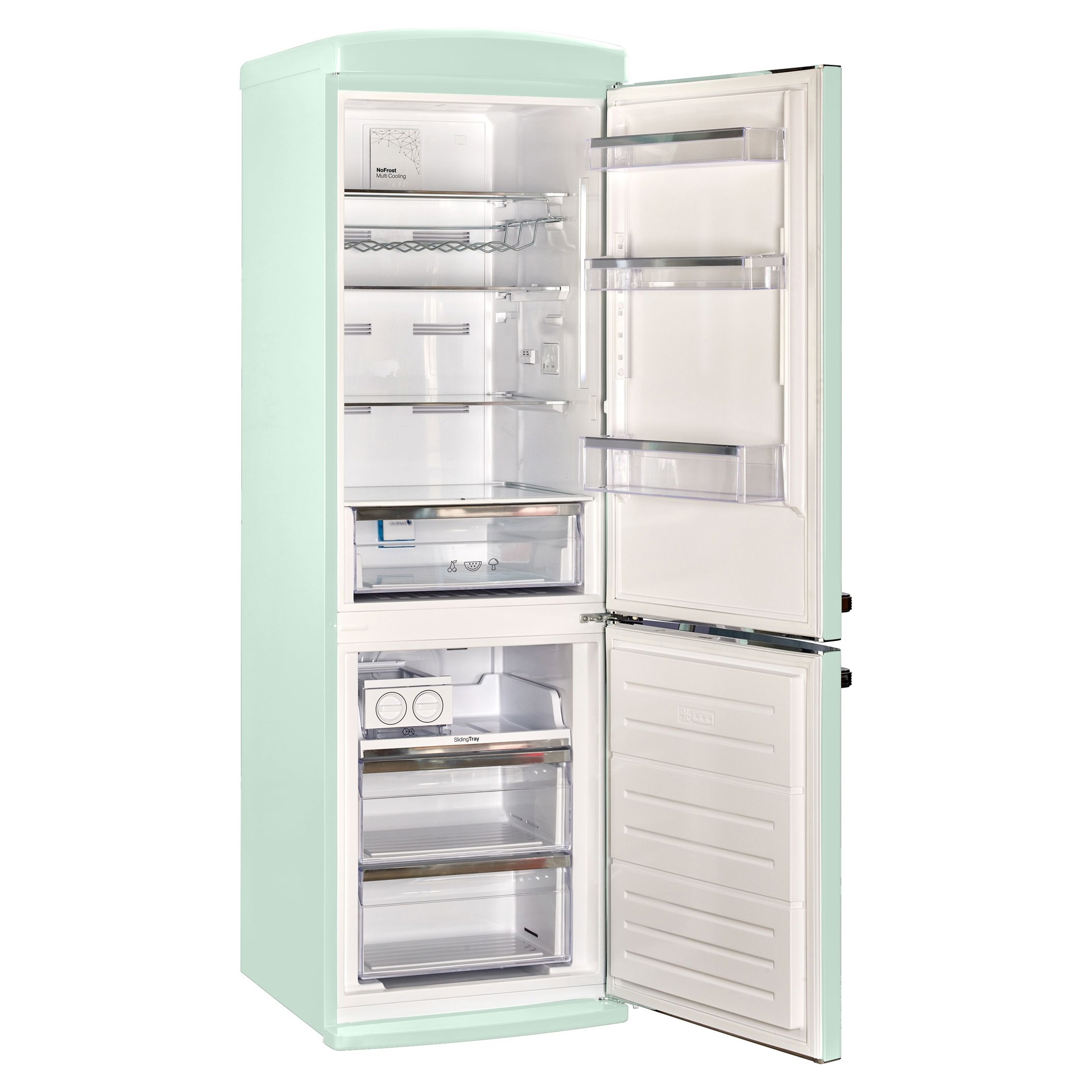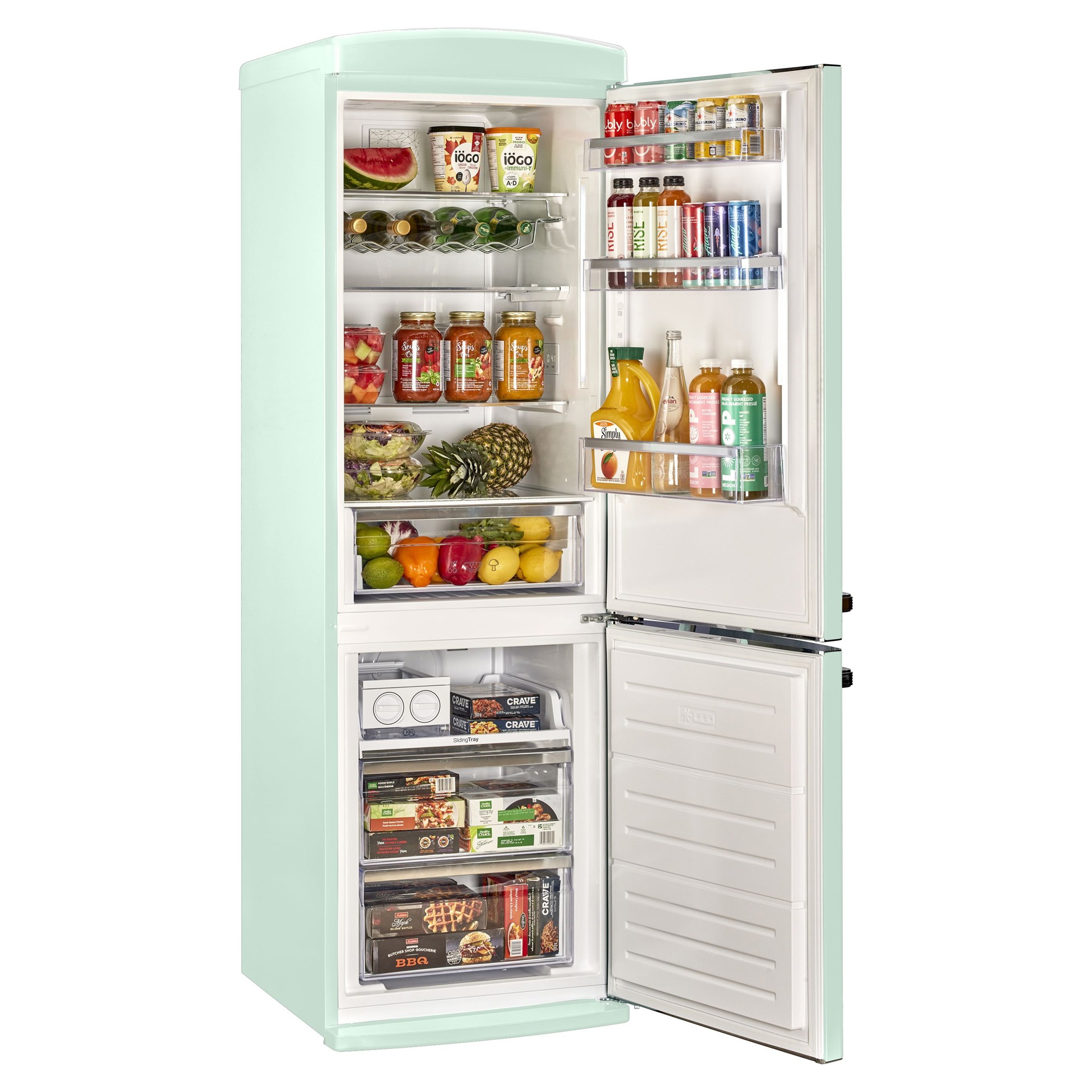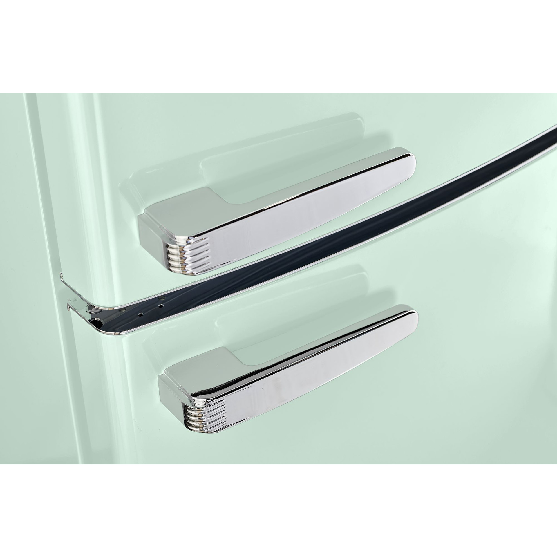 Le réfrigérateur à congélateur inférieur vous ramène au design rétro emblématique et aux accents chromés.