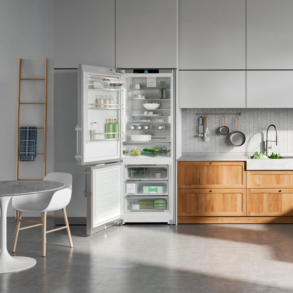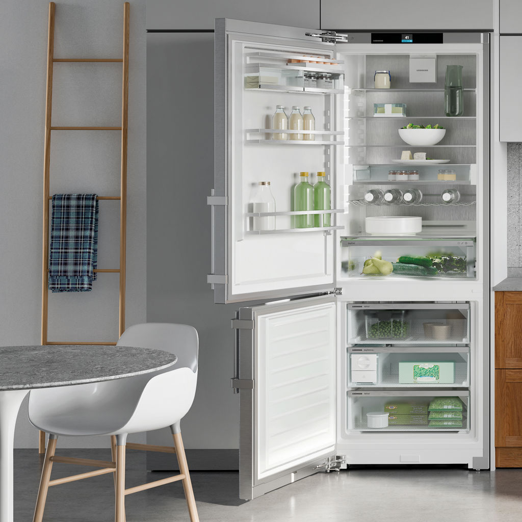 Ce réfrigérateur à congélateur inférieur de 30 pouces de Liebherr est doté des technologies Duo Cooling, EasyFresh, Power Cooling et Smart Device Box.