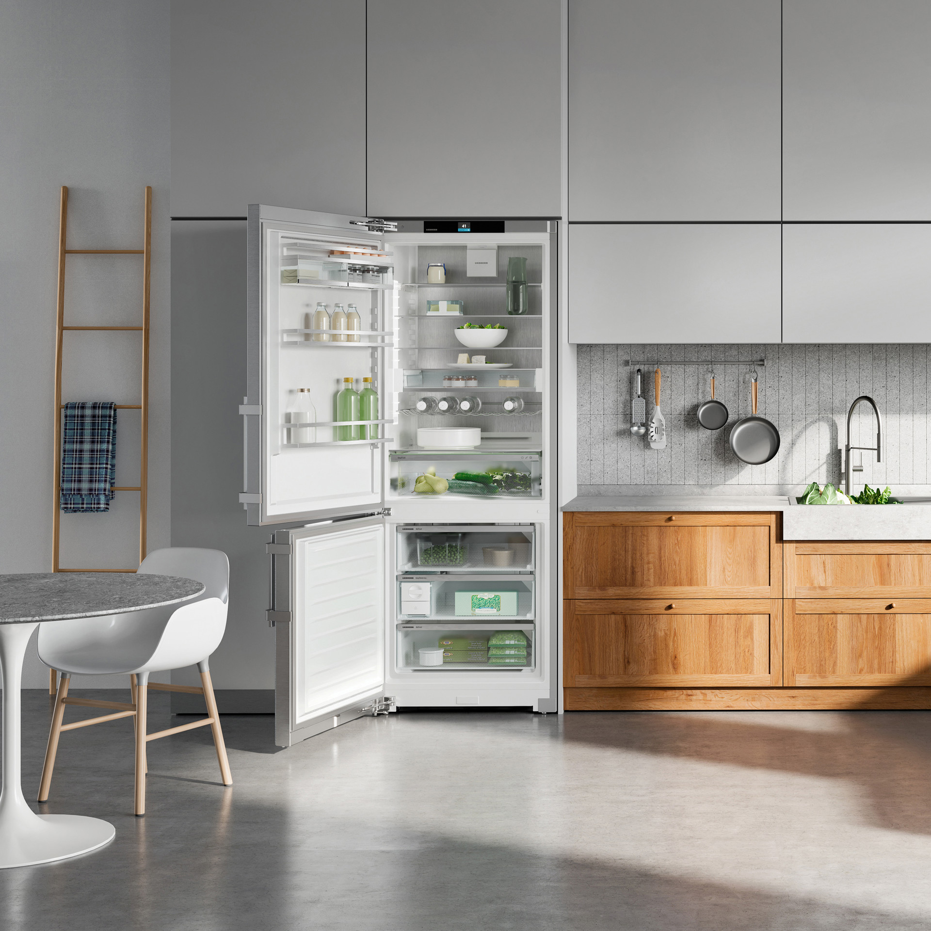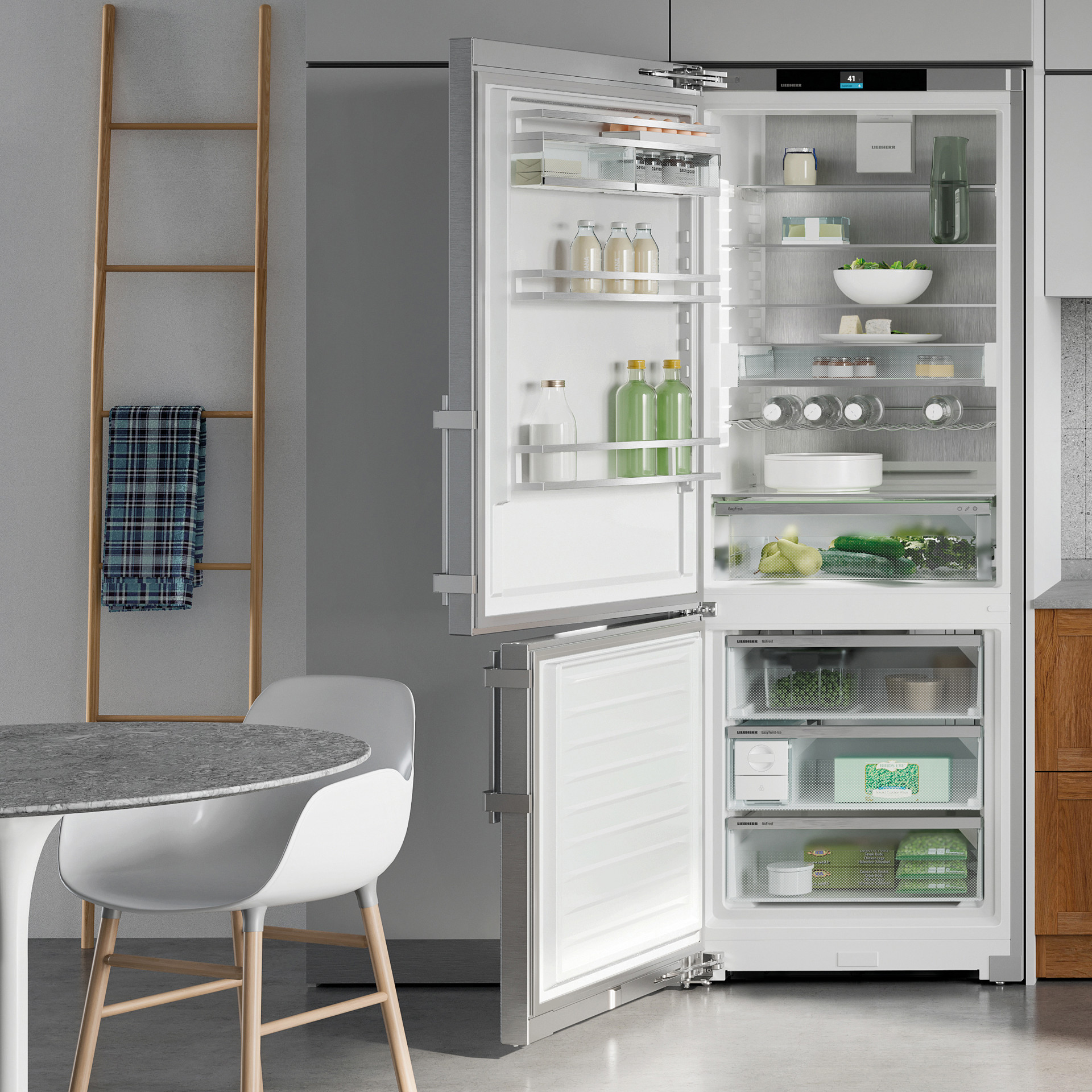 La garantie de la fraîcheur du marché dans la maison est l’EasyFresh-Safe de Liebherr. Qu’il s’agisse de légumes ou de fruits non emballés, cela garantit un stockage optimal pour tout. Grâce à la fermeture hermétique, les aliments font monter l’humidité dans le coffre-fort. Cela permet de garder les aliments frais pendant longtemps.