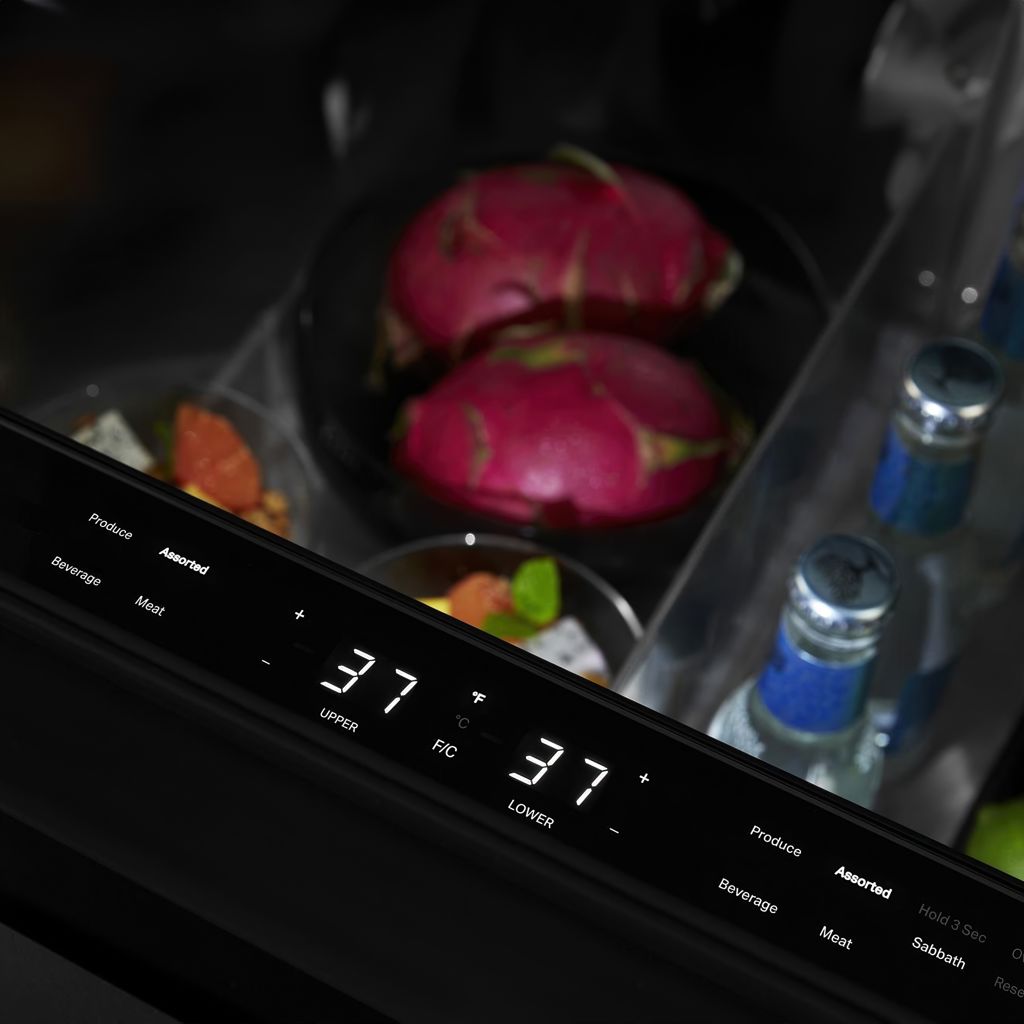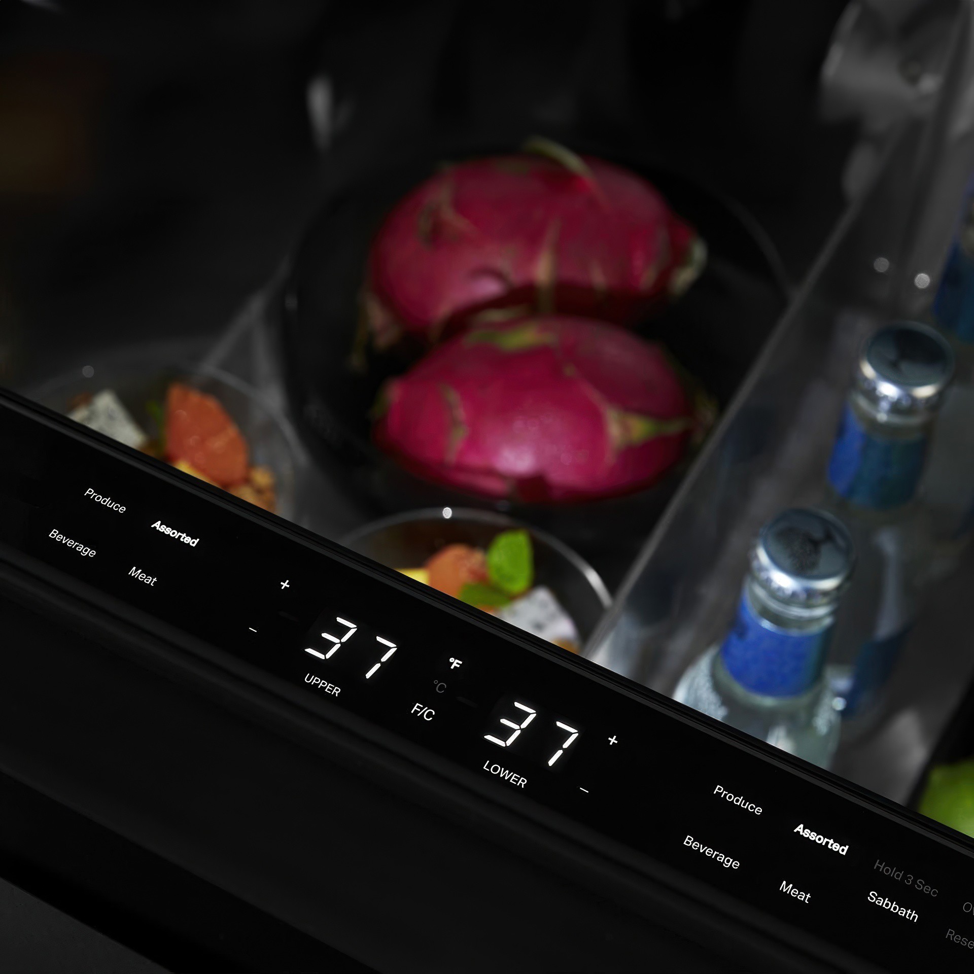 Deux tiroirs de réfrigérateur à fermeture douce avec des intérieurs Obsidian audacieux apportent de la fraîcheur là où vous en avez besoin, que ce soit dans l'espace sous le comptoir d'un garde-manger de majordome, d'une zone de préparation, d'un bar ou d'une salle de divertissement. Définissez des zones de température indépendantes avec des préréglages adaptés à votre style de vie et à votre espace.