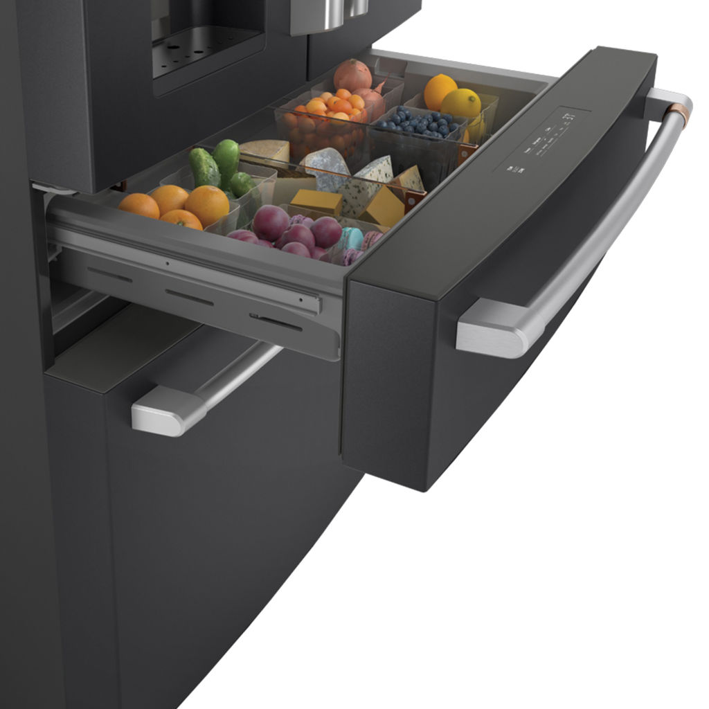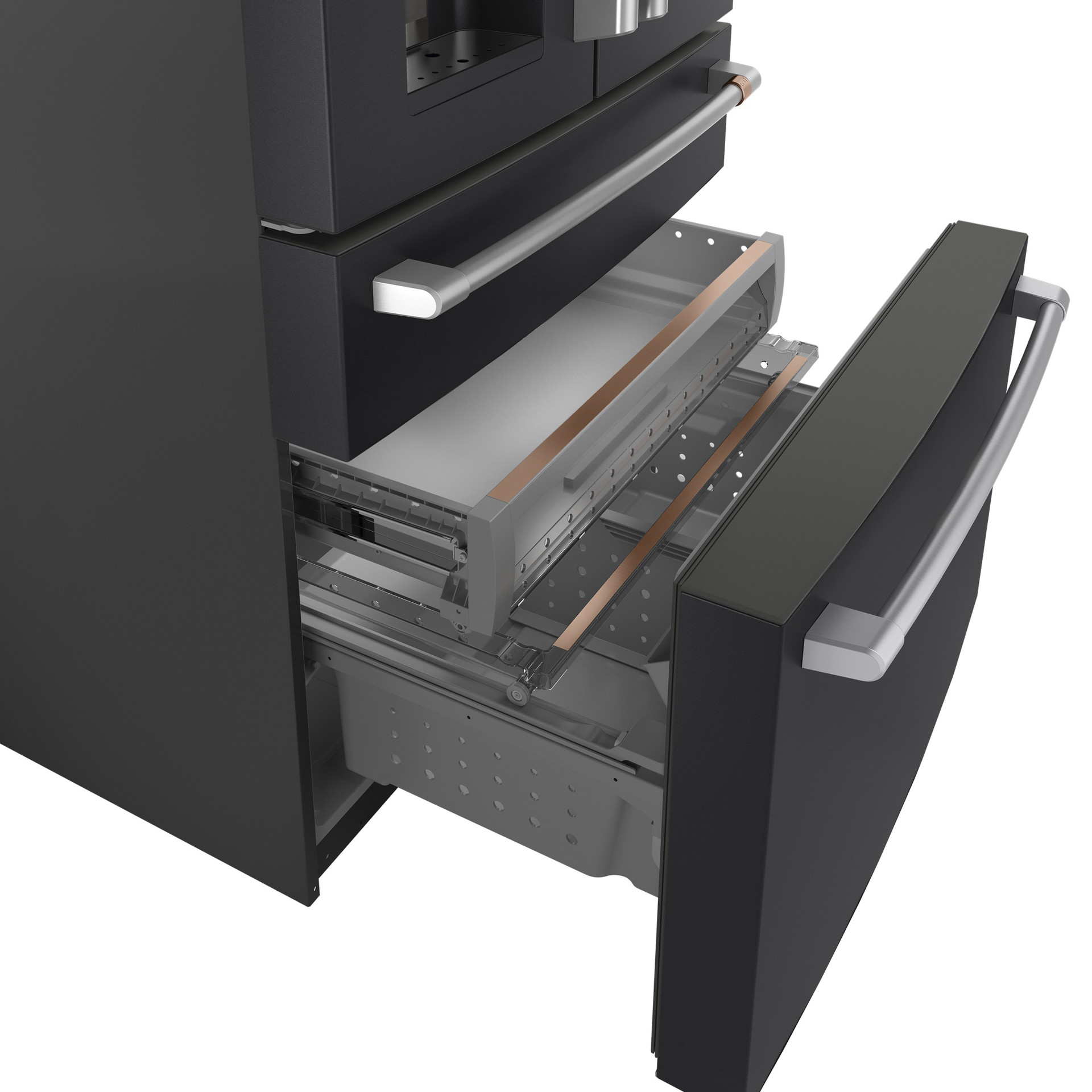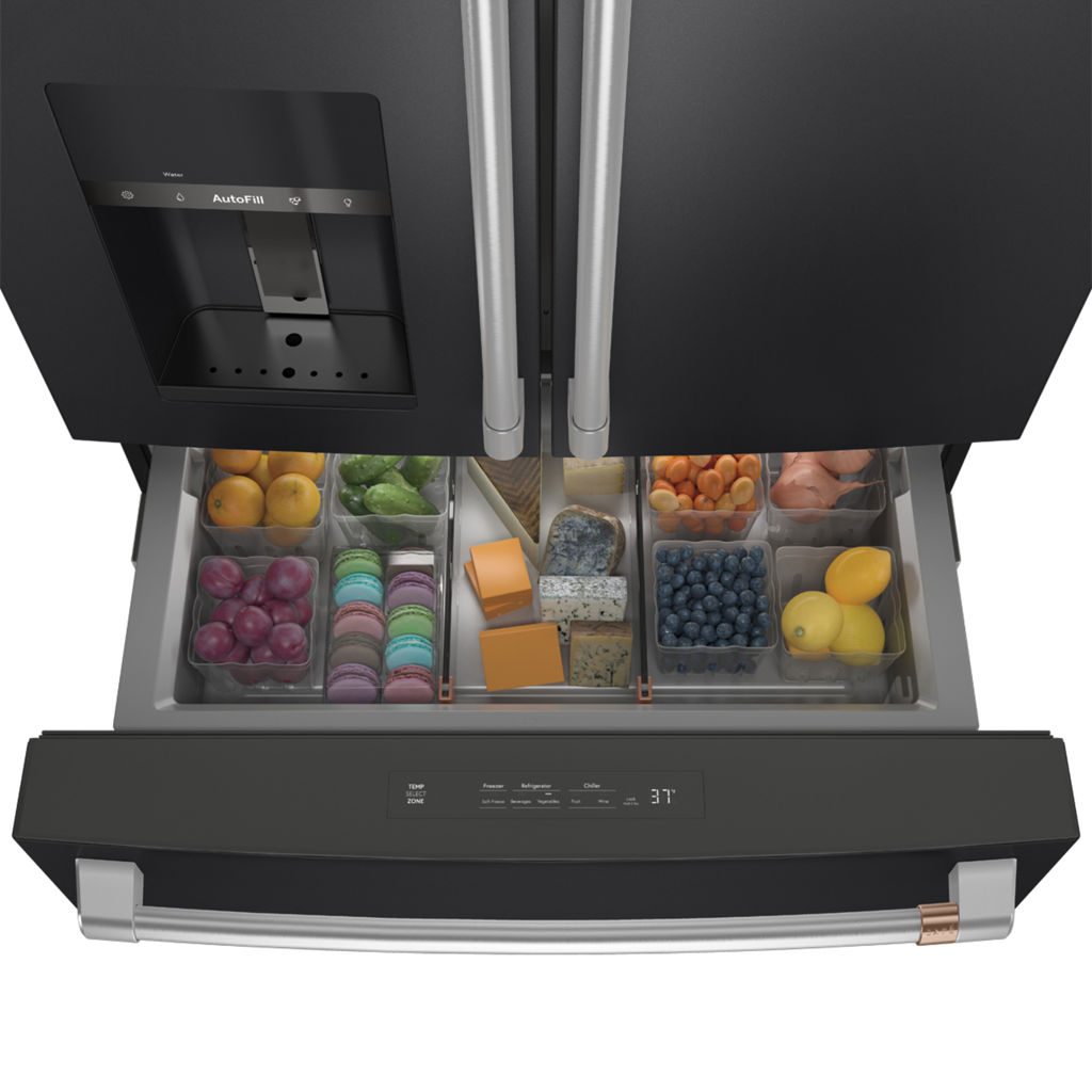 Découvrez un style indéniable derrière chaque porte avec le réfrigérateur 4 portes de CAFÉ™. Des détails esthétiques sophistiqués vous invitent à découvrir des fonctionnalités imaginatives, telles que le tiroir convertible avec réglage Soft Freeze et le distributeur mains libres Autofill, pour une solution de réfrigération qui correspond à votre style.