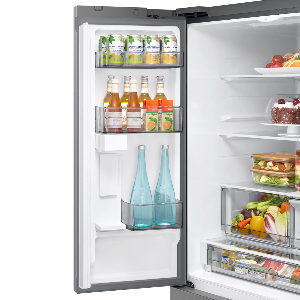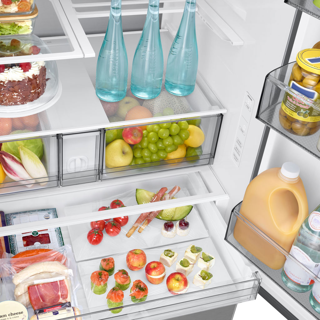 Le compartiment réfrigérateur propose un vaste espace d’environ 20,8 pi³, incluant plusieurs tablettes en verre trempé résistantes aux éclaboussures, un tiroir pleine largeur ainsi que deux tiroirs transparents pour les fruits et légumes. Les nombreux balconnets de porte permettent de ranger facilement les contenants volumineux, dont un balconnet pour gallon. Le congélateur offre une capacité d’environ 8,7 pi³ avec éclairage DEL pour une visibilité optimale.