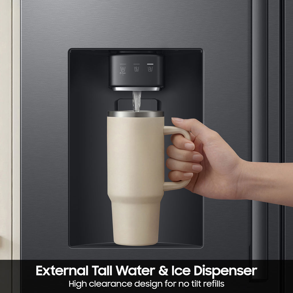 Pensé pour répondre aux besoins du quotidien, ce modèle est doté d’un distributeur externe d’eau filtrée et de glace ainsi que d’un système de production de glace polyvalent incluant la glace sphérique Sphere Ice™, la glace courbée et la glace concassée. Les fonctions Power Cool et Power Freeze permettent de refroidir ou congeler rapidement les aliments, tandis que la technologie AI Precise Cooling maintient une température uniforme pour préserver la fraîcheur.