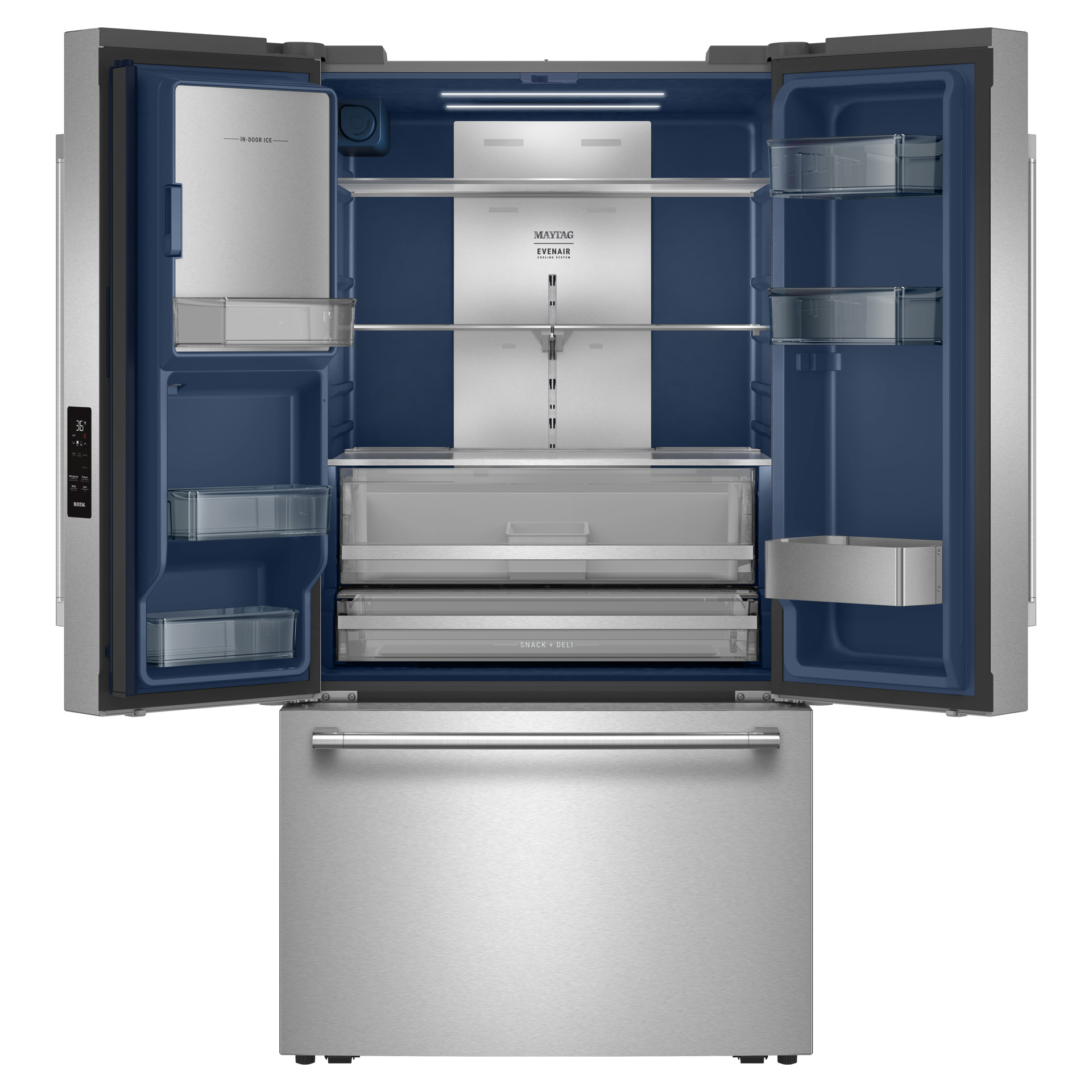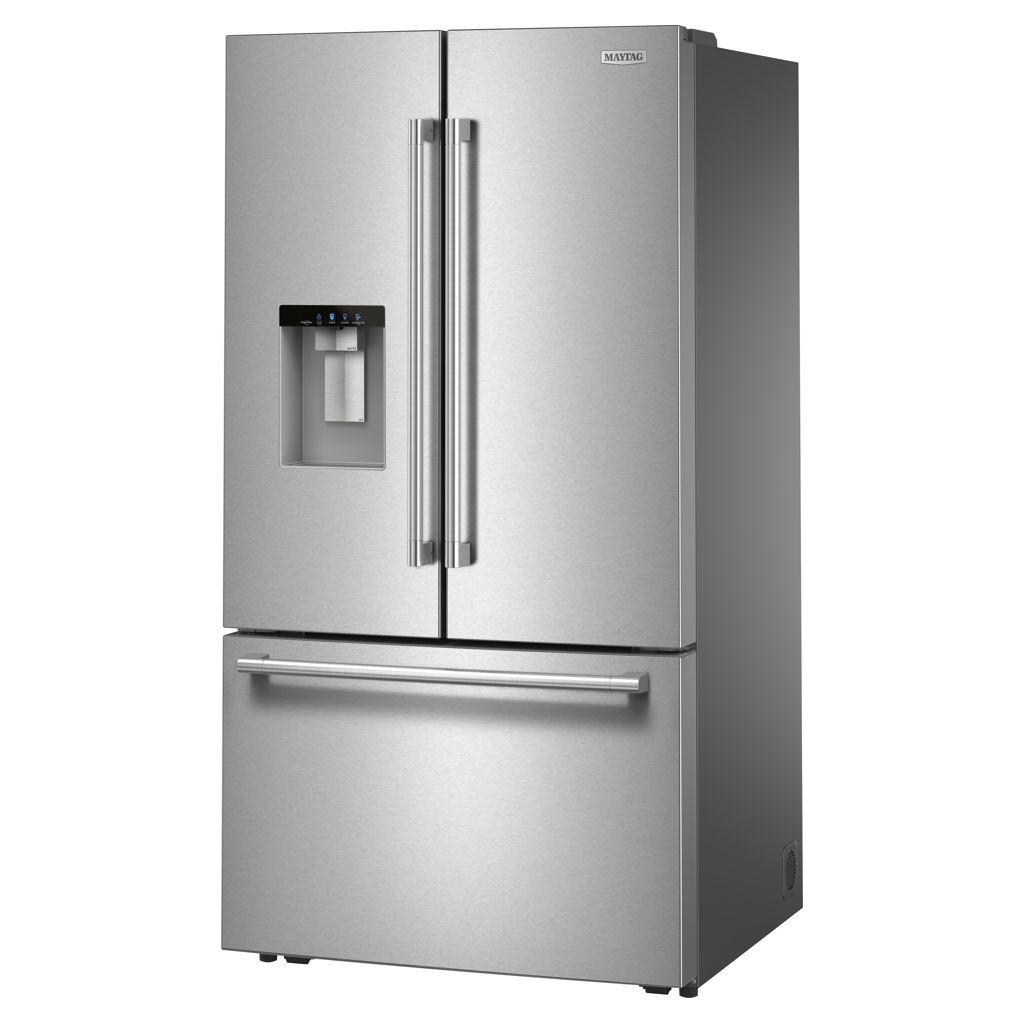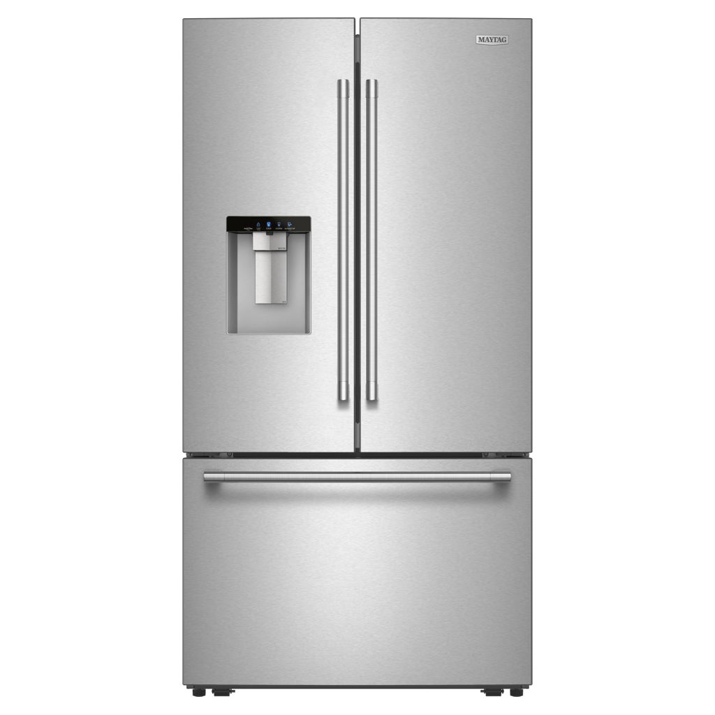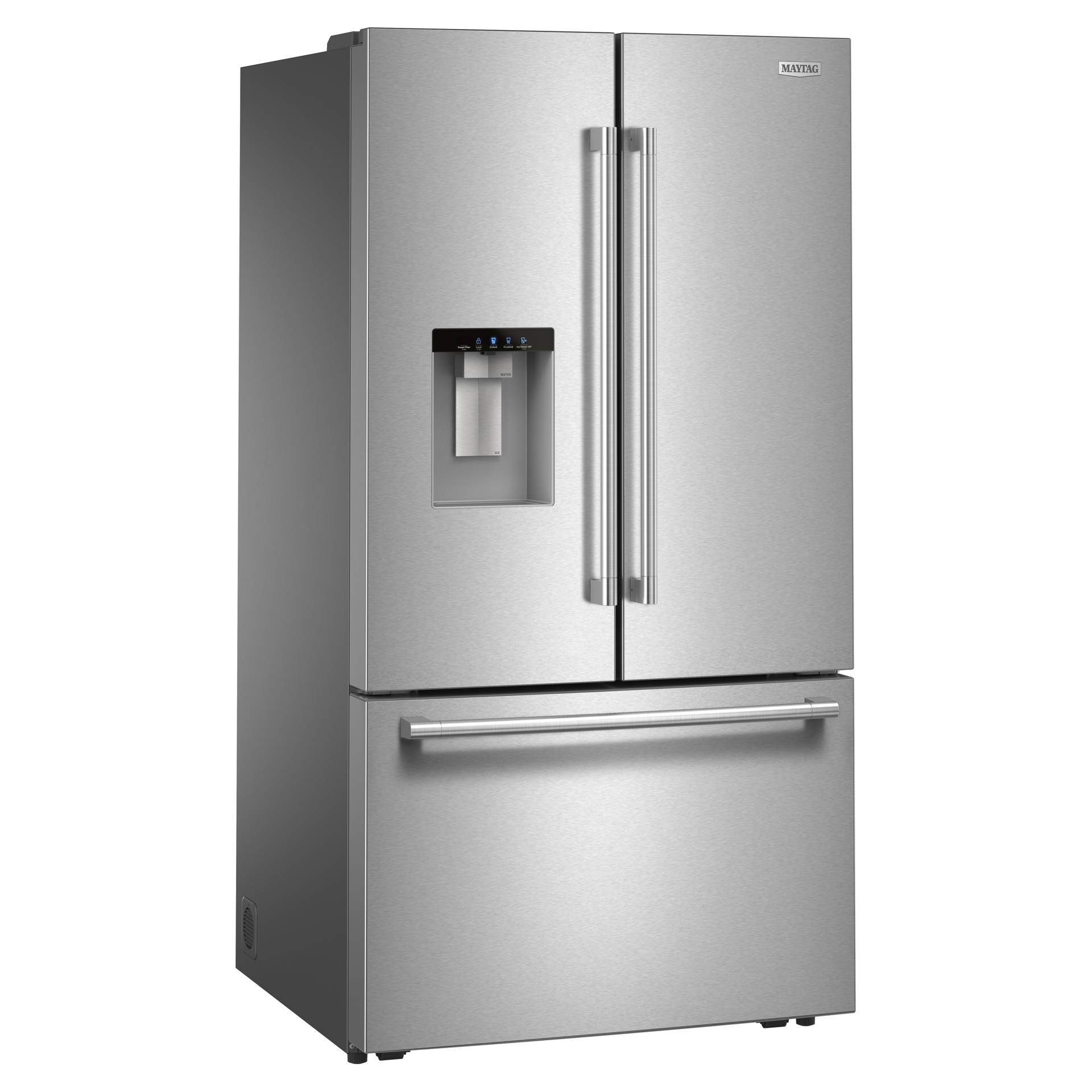 Ce réfrigérateur Maytag® à portes françaises, équipé de distributeurs d'eau et de glaçons, est conçu avec des composants et des fonctionnalités qui garantissent un froid optimal. Son revêtement en acier inoxydable anti-traces de doigts lui permet de conserver une apparence aussi impeccable à l'extérieur qu'à l'intérieur.