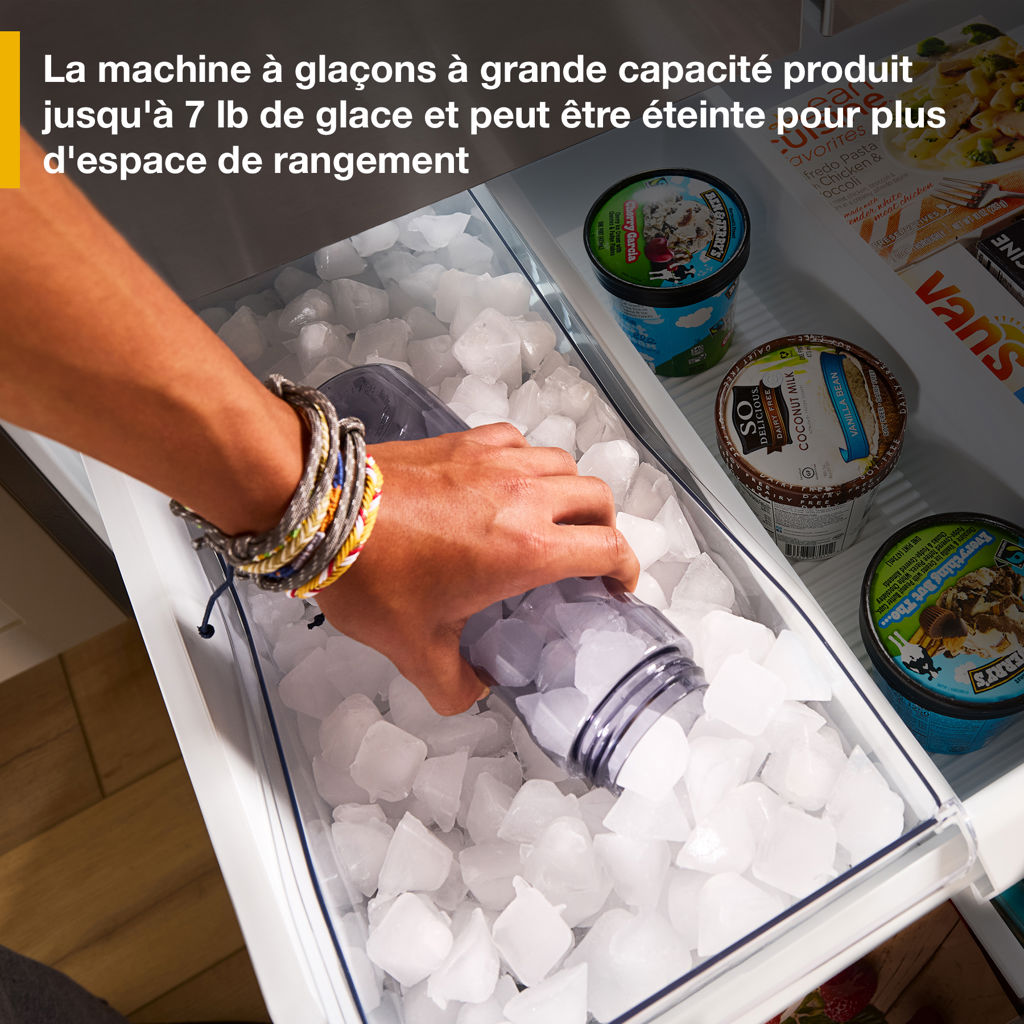 Obtenez de l’eau filtrée à la simple pression d’un bouton avec le distributeur d'eau filtrée dans la porte. La grande capacité de production de glaçons procure plus de 3 livres de glace filtrée par jour.