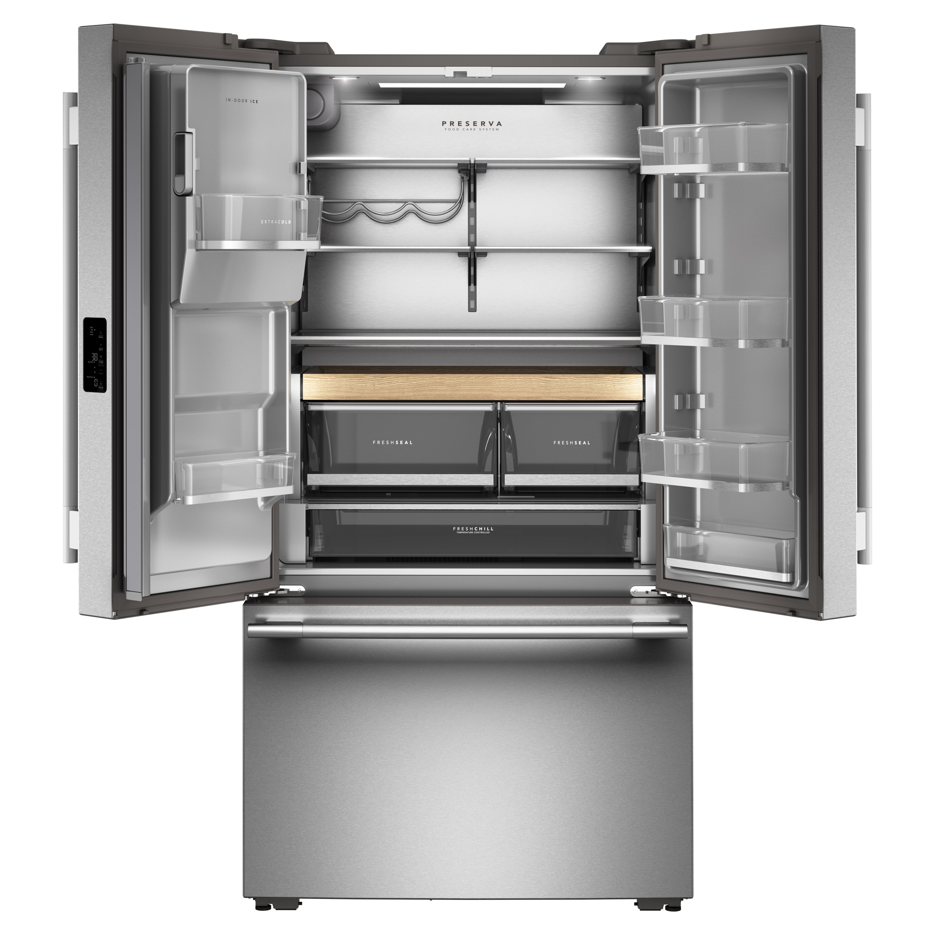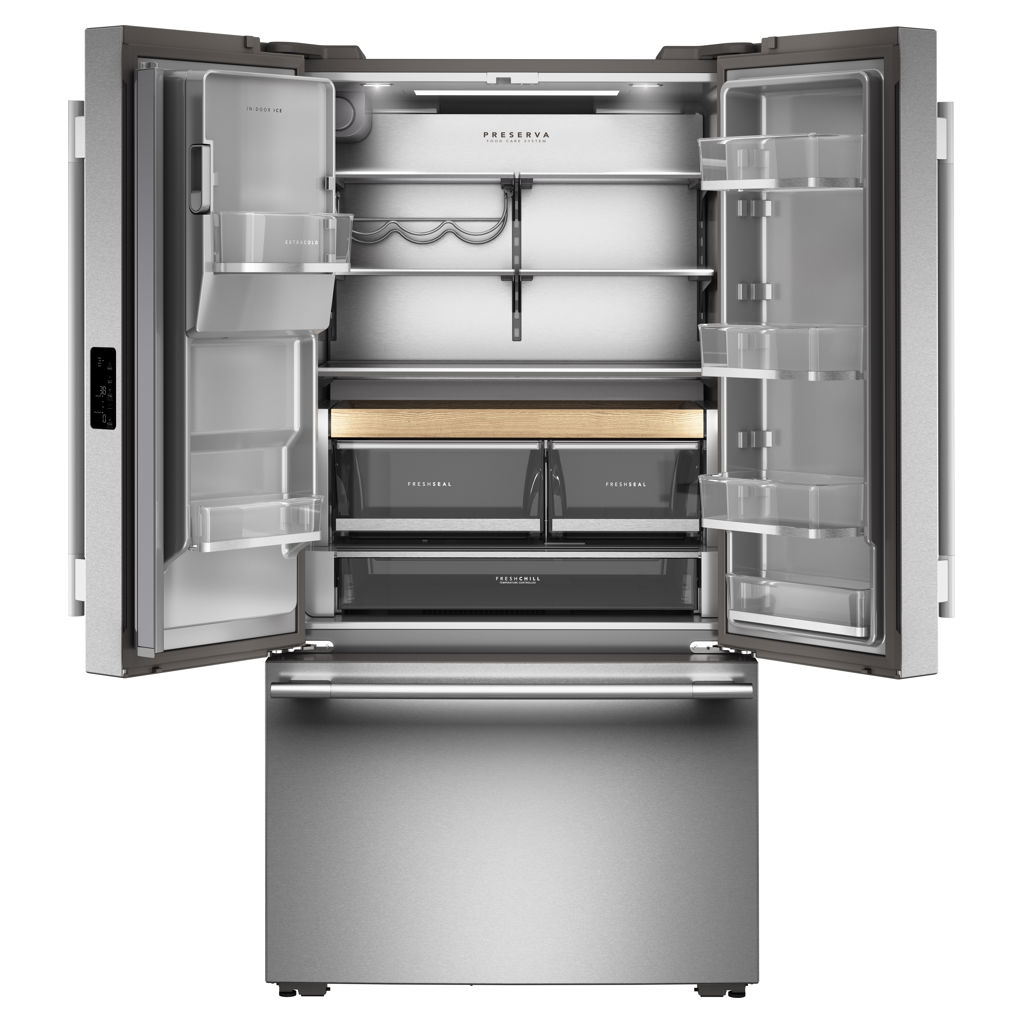 Gardez vos aliments frais et savoureux grâce au système de conservation Preserva™, au tiroir garde-manger pleine largeur FreshChill™ à température contrôlée doté de réglages de température prédéfinis et aux bacs à légumes FreshSeal™ à humidité contrôlée pleine extension.