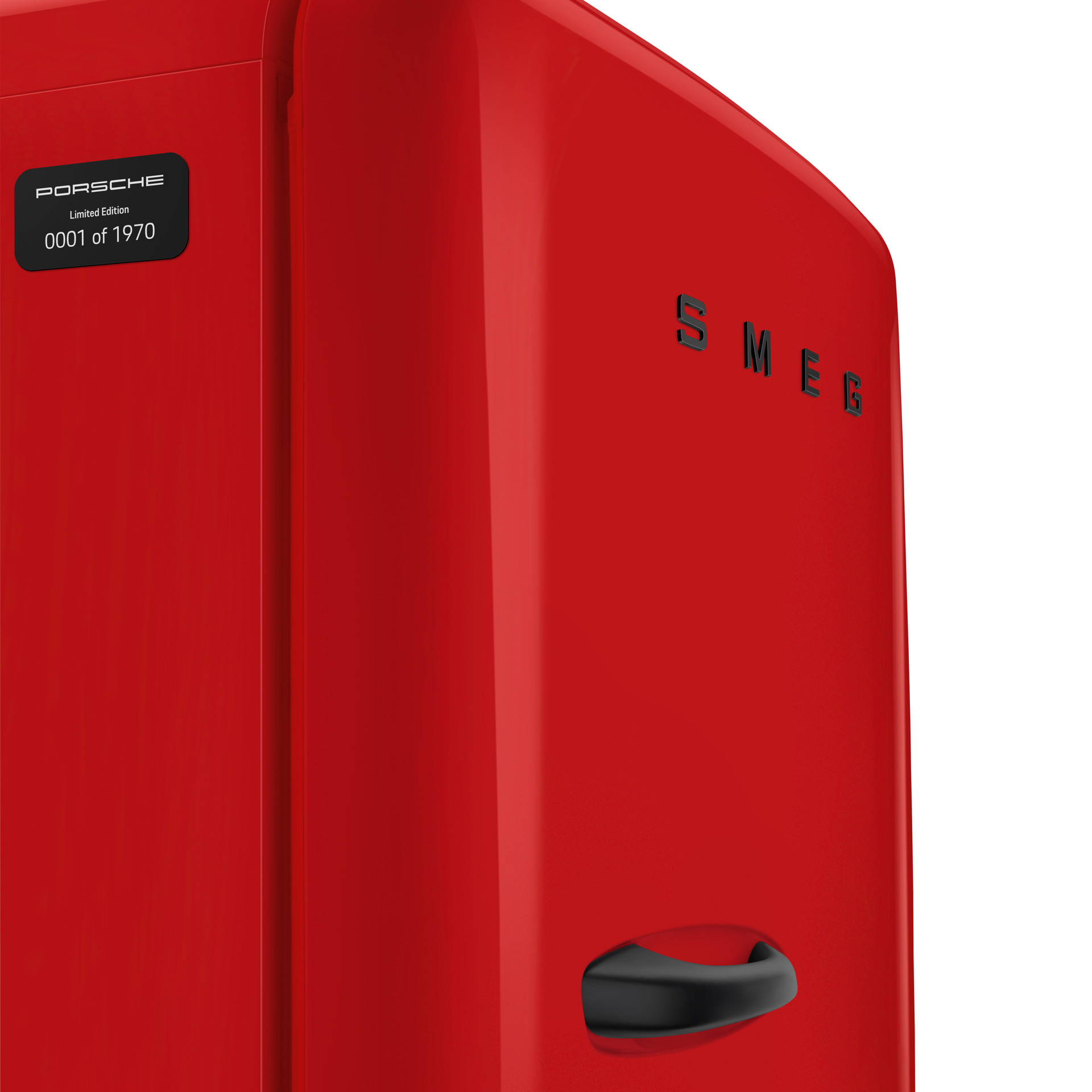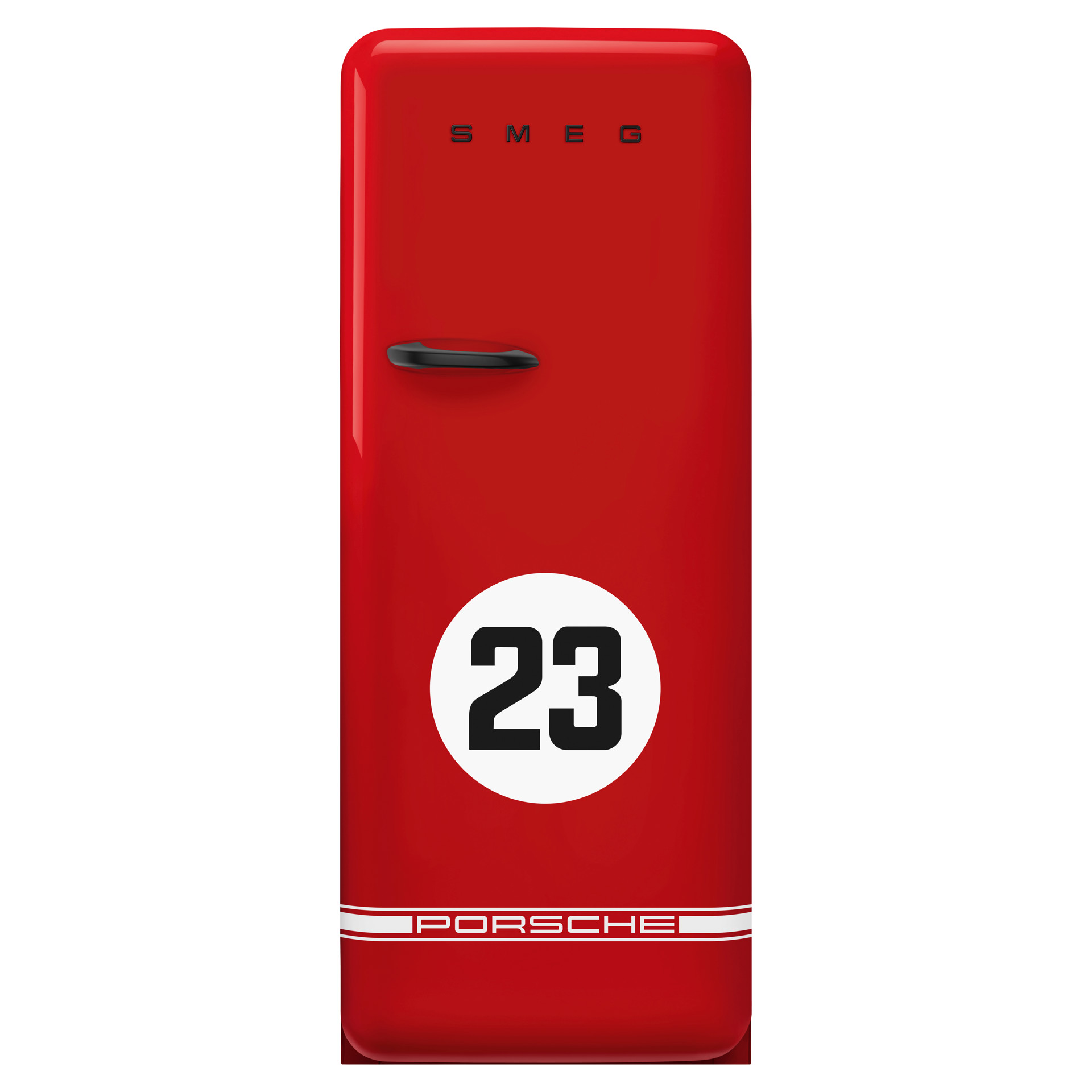 Le réfrigérateur Smeg emblématique est personnalisé avec des éléments Porsche. Le produit présente une porte et une poignée au design spécial qui reflètent la Porsche 911 GT3 RS. Le design de la poignée est soigneusement proportionné à la taille du réfrigérateur afin de garantir une esthétique harmonieuse.