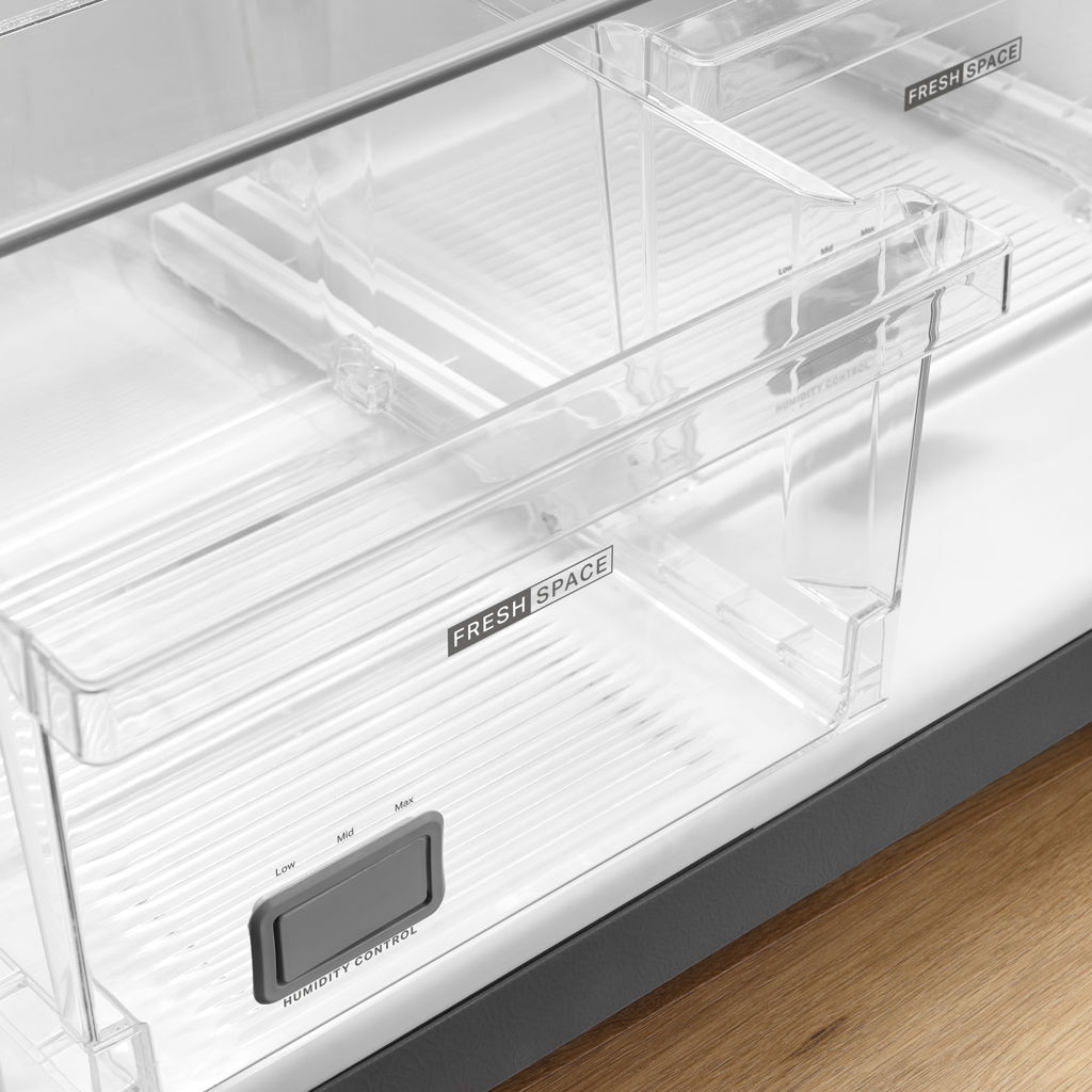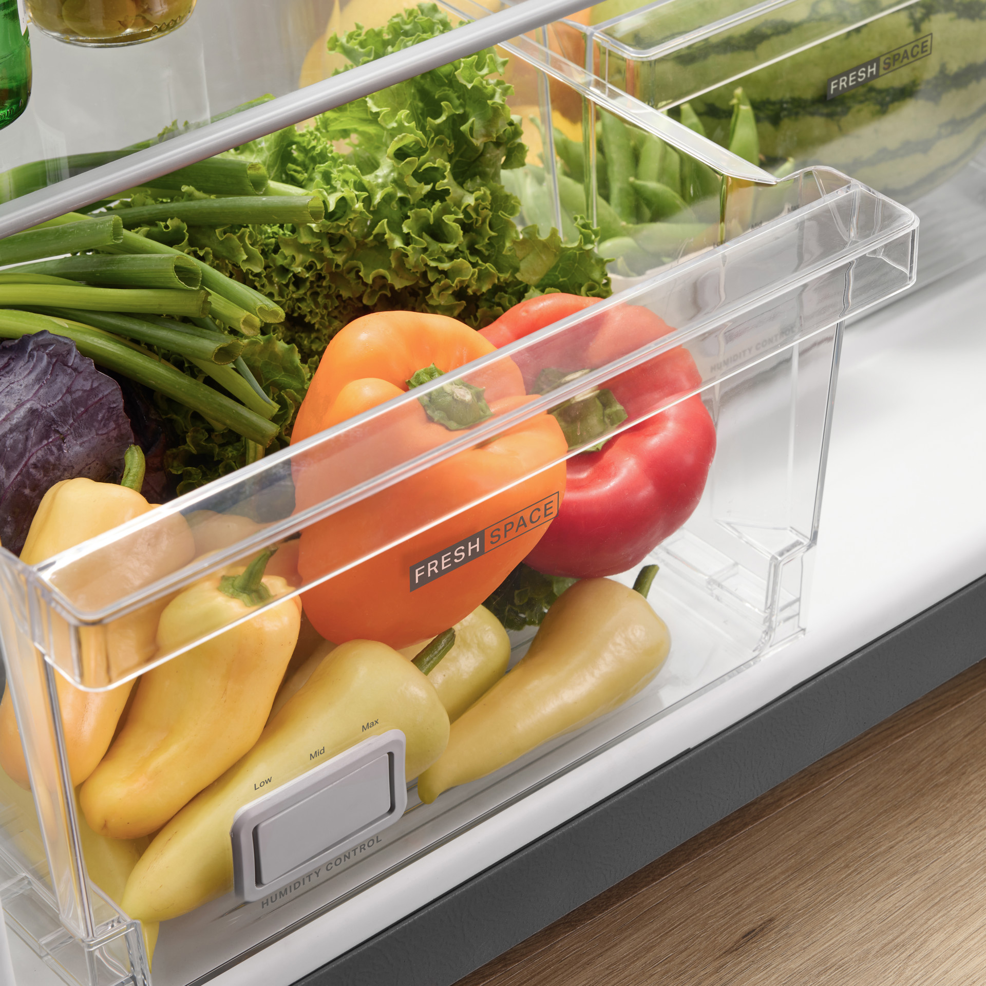 Les bacs à légumes FreshSpace™ à contrôle d'humidité préservent la fraîcheur optimale des fruits et légumes. Augmentez l'humidité pour des brocolis croquants et de la laitue bien fraîche, ou diminuez-la pour des pêches et des raisins mûrs, afin que vos aliments préférés restent frais pour chaque collation ou repas en famille.