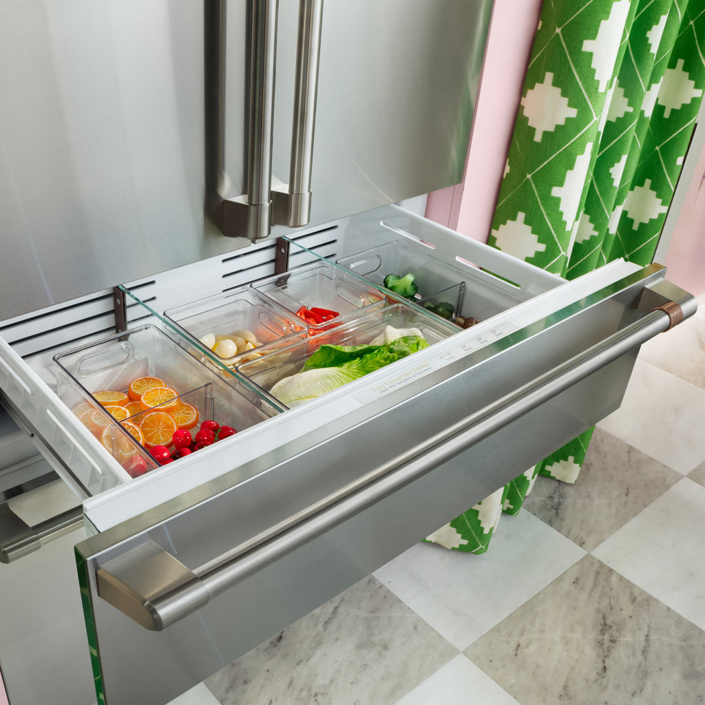 Un système de contrôle de l'humidité offre une zone climatique permettant aux légumes verts de durer deux fois et demie plus longtemps que dans des bacs à légumes standard.