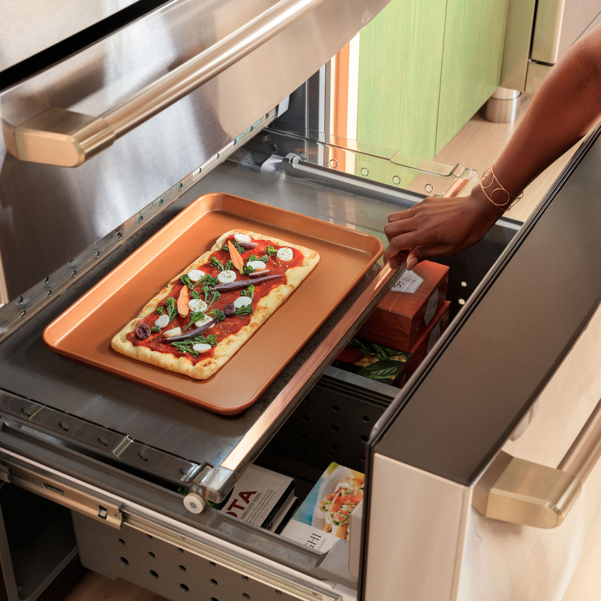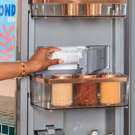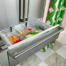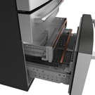 Un compartiment congélateur mince et pleine largeur conçu pour contenir du pain plat, des pizzas et d'autres articles surgelés de forme unique est l'une des nombreuses étagères et plateaux coulissants de ce système de stockage à trois niveaux.