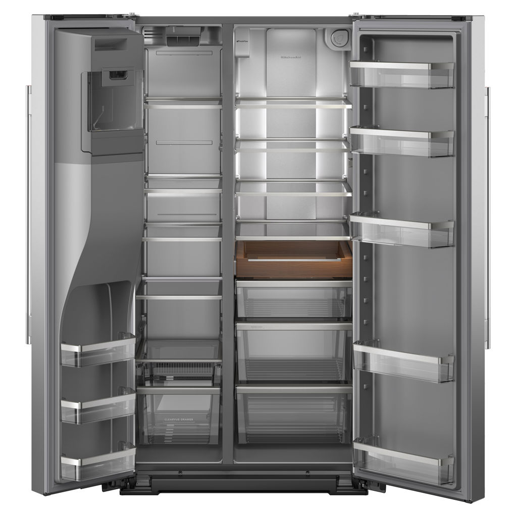 Le réfrigérateur côte à côte doté de plus grande capacité de la marque KitchenAid fait de la place pour toutes les courses d'épicerie et de marché avec une capacité de 28,7 pi³ et des espaces dédiées à vos ingrédients spéciaux.