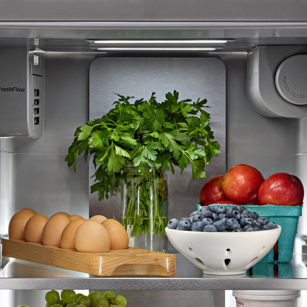 L’éclairage panoramique à DEL illumine l'arrière du réfrigérateur pour que les ingrédients restent visibles et faciles à trouver. La tour d'éclairage arrière, combinée à des bandes lumineuses à DEL supplémentaires dans le réfrigérateur et le congélateur, illumine l'ensemble du réfrigérateur.
