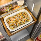 Le plateau de rangement coulissant en simili bois permet d'accéder facilement aux plats de service et aux ingrédients.
