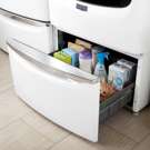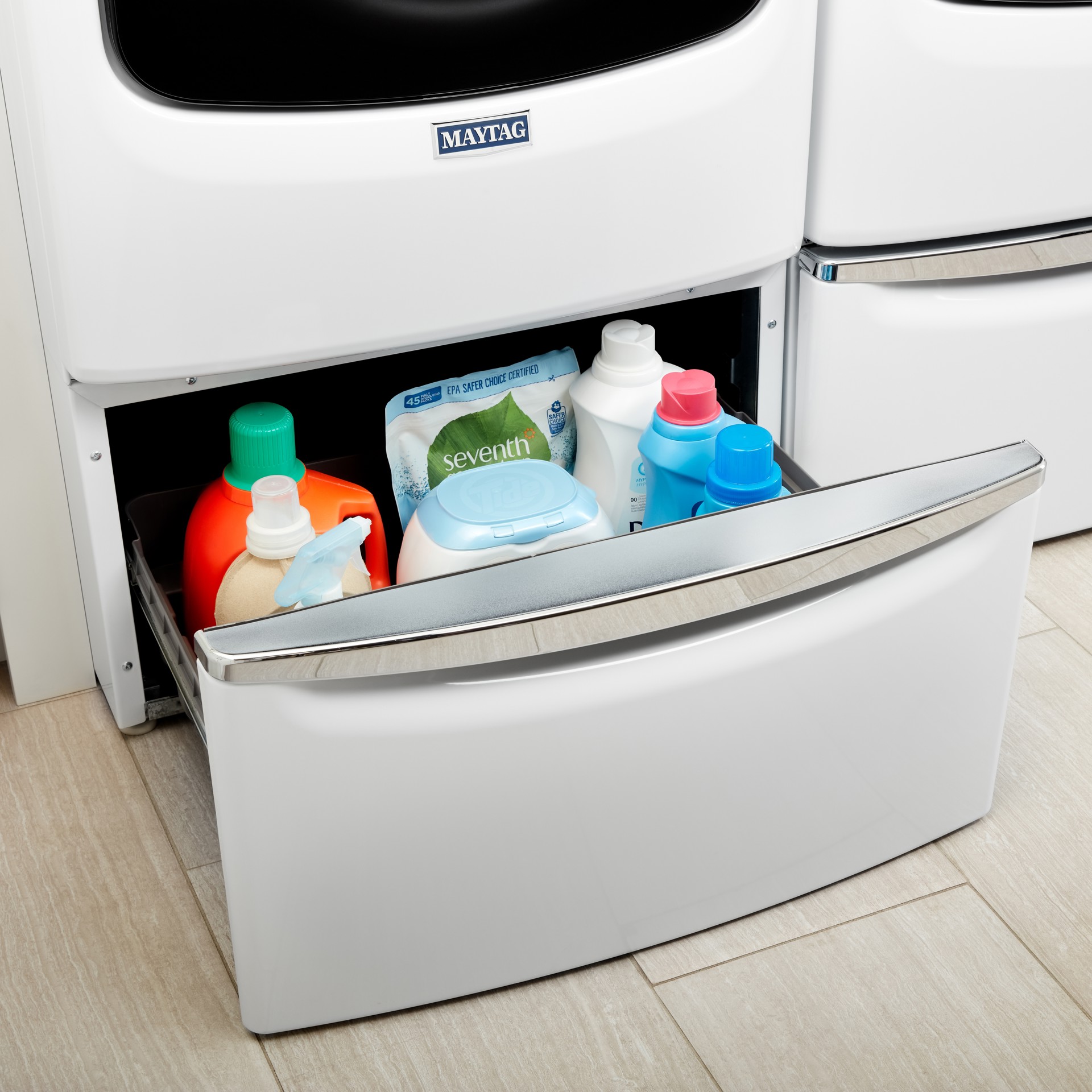 Le grand tiroir de rangement dissimule vos produits de lessive, même les formats économiques. Sa poignée chromée offre une prise agréable pour un accès facile à vos essentiels.