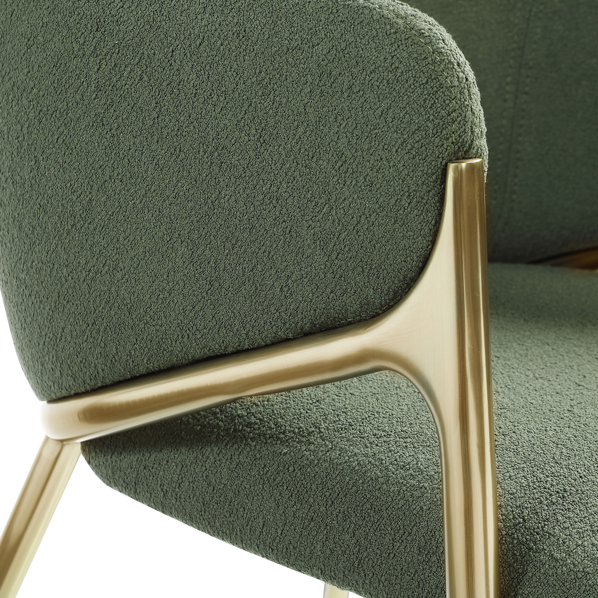 Cette magnifique chaise offre tout ce que vous attendez d'un design moderne du milieu du siècle, de son riche tissu bouclé vert à son siège et son dossier fortement rembourrés, en passant par sa structure en fer et sa finition en laiton brossé.