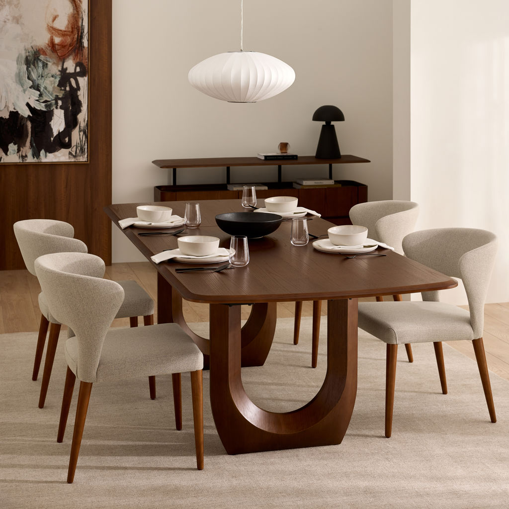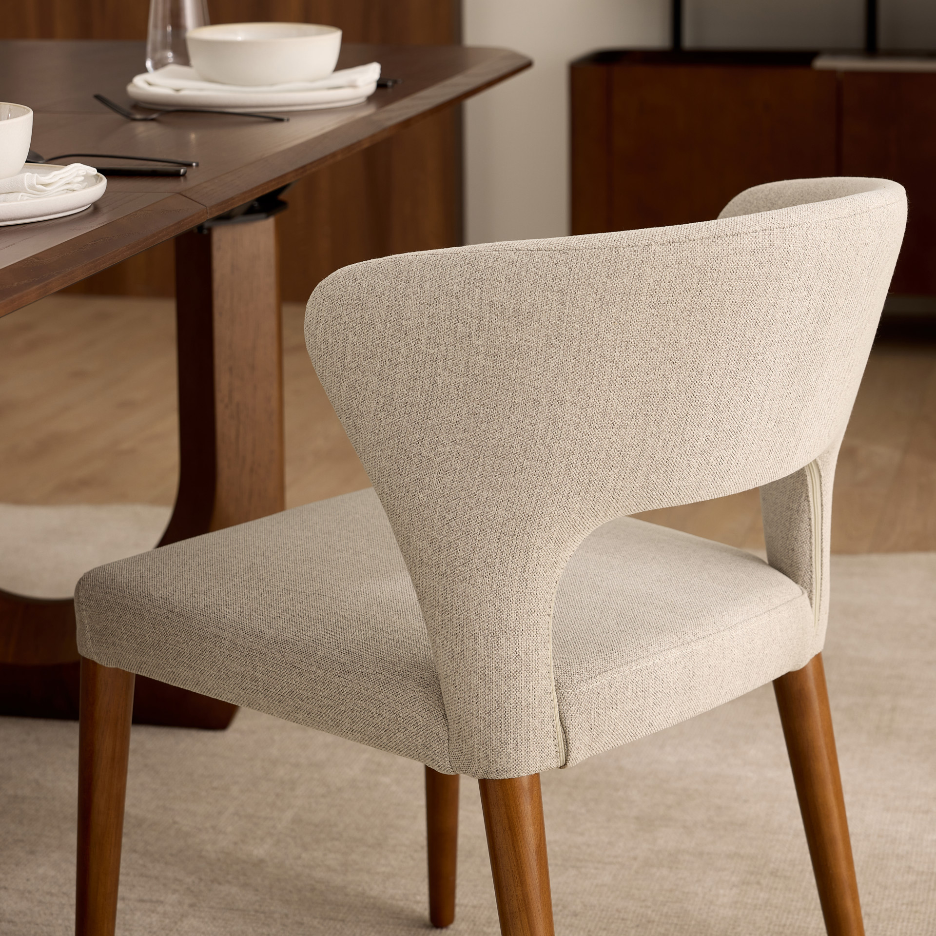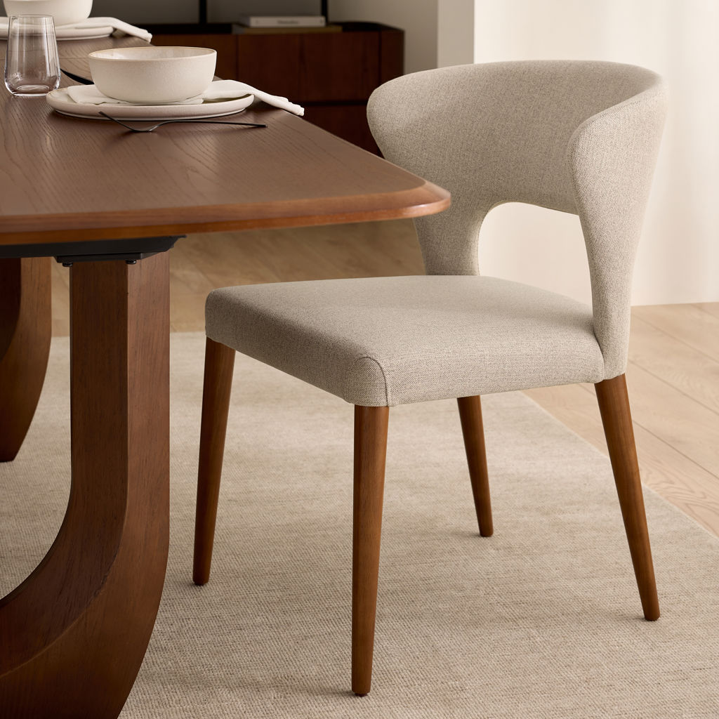 Élégante et enveloppante, cette chaise de salle à manger allie confort et style avec brio. Sa silhouette incurvée épouse naturellement le dos pour un soutien optimal, tandis que le revêtement en tissu texturé crème apporte douceur et raffinement à votre décor. Les pieds fuselés en bois massif ajoutent une touche chaleureuse et rétro, parfait pour une salle à manger moderne ou contemporaine.