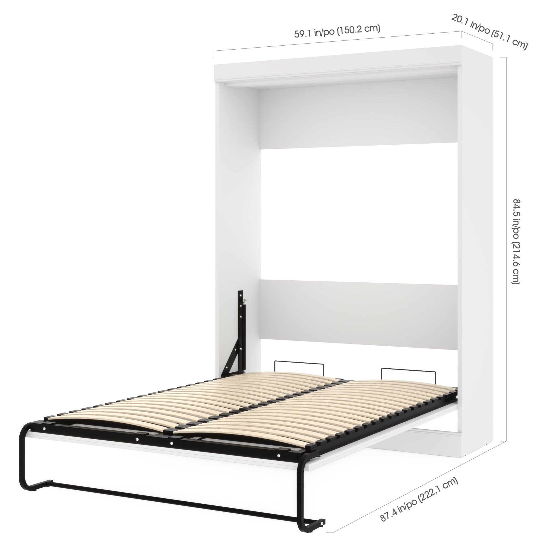 Ce lit escamotable deux places (double) solide et confortable peut être utilisé toutes les nuits, c’est le meuble gain de place idéal pour toute pièce multifonctionnelle. Le lit se relève et s’abaisse de façon sécuritaire grâce au mécanisme à double piston et le support de matelas à lattes Euroslat augmente votre confort pour une bonne nuit de sommeil.
