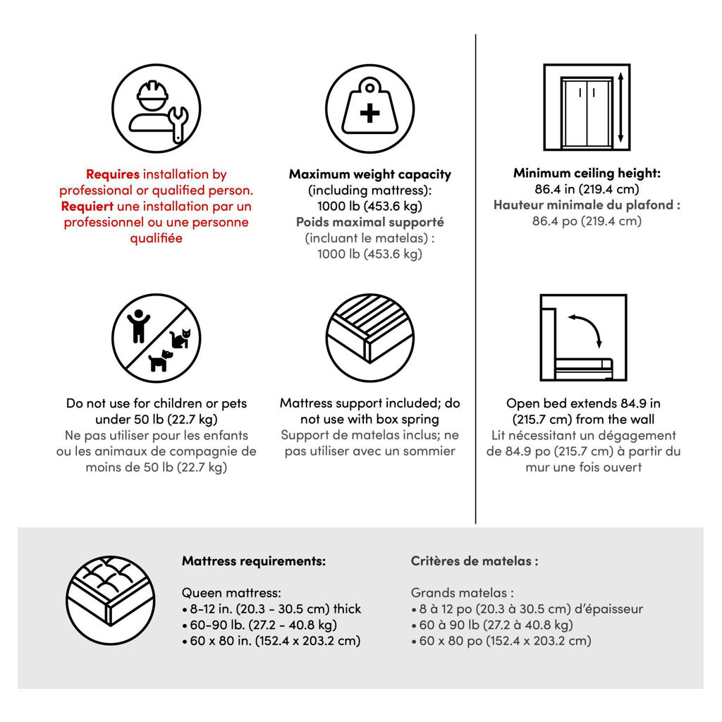 **Afin d’éviter tout risque de blessure, confiez l’installation à un professionnel ou à une personne qualifiée qui connaît la structure du mur, les montants et les composantes. Le lit peut être fixé à des montants de bois ou de métal ou à des structures murales en maçonnerie; des vis à béton (non fournies) doivent être utilisées pour les murs en maçonnerie.