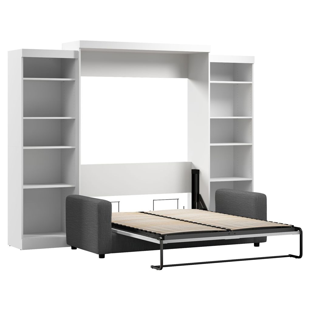 Cet ensemble comprend un grand lit escamotable (queen), unités de rangement et un sofa.