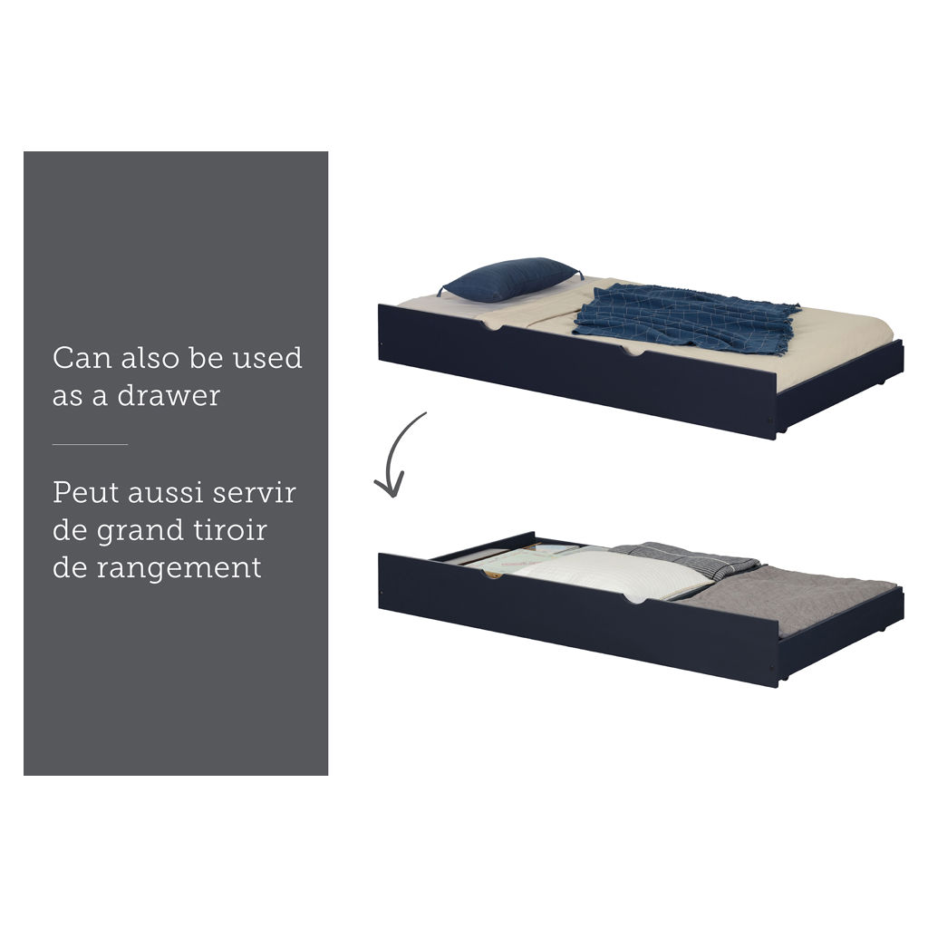 Ce lit gigogne contemporain sur roulettes se glisse facilement dessous un lit. Ses poignées découpées font qu´il est très facile à tirer quand vous en avez besoin. C´est parfait pour quand votre enfant reçoit un ami à dormir à la maison. Il ne manque plus qu´à sortir le popcorn et les bonbons pour une soirée pyjama réussie! Se transforme en tiroir. Des séparateurs amovibles peuvent être installés dans le lit pour en faire des tiroirs lorsqu´aucun invité n´est à la maison. Ils vous fourniront un espace de rangement supplémentaire pour les effets personnels de vos enfants et ça, ce n´est jamais de trop!