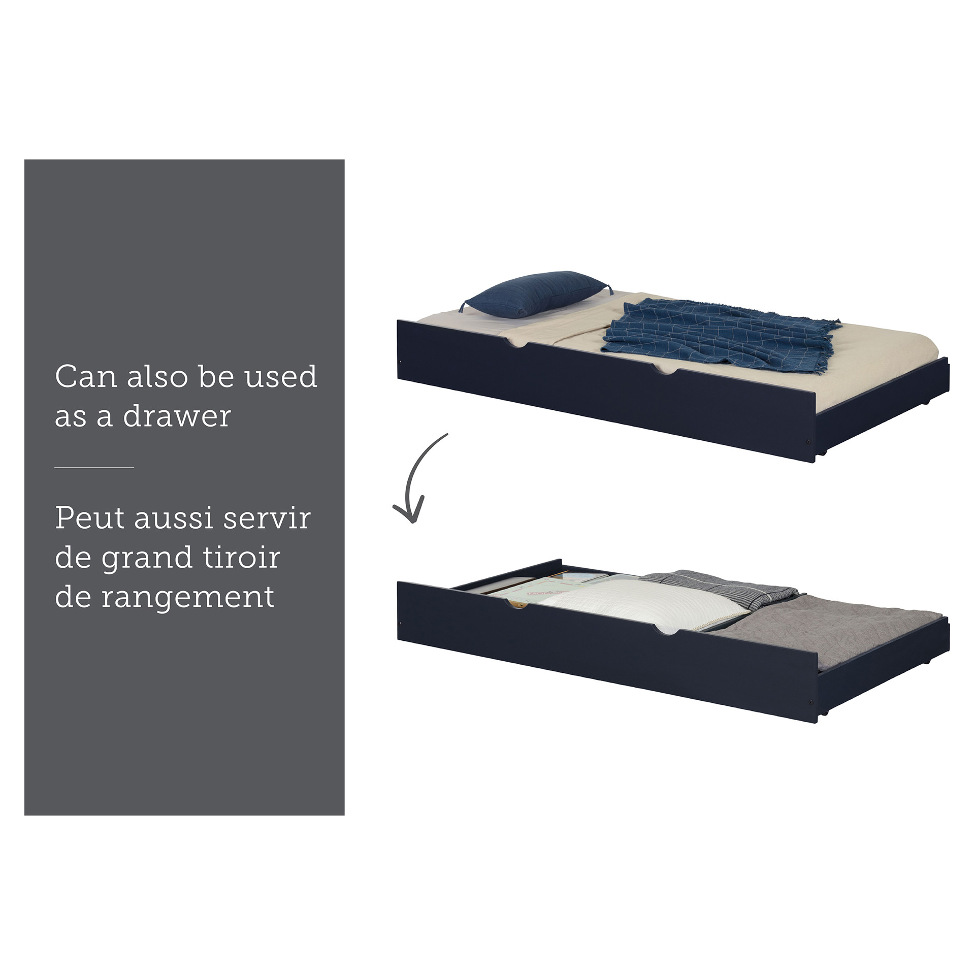 LIT SUR ROULETTES: glissez ce lit gigogne sur roulettes sous le lit de votre enfant quand il reçoit des amis! Il peut accueillir un matelas d´une grandeur de 6 pouces (non inclus) et supporter un poids maximal de 250 lb.