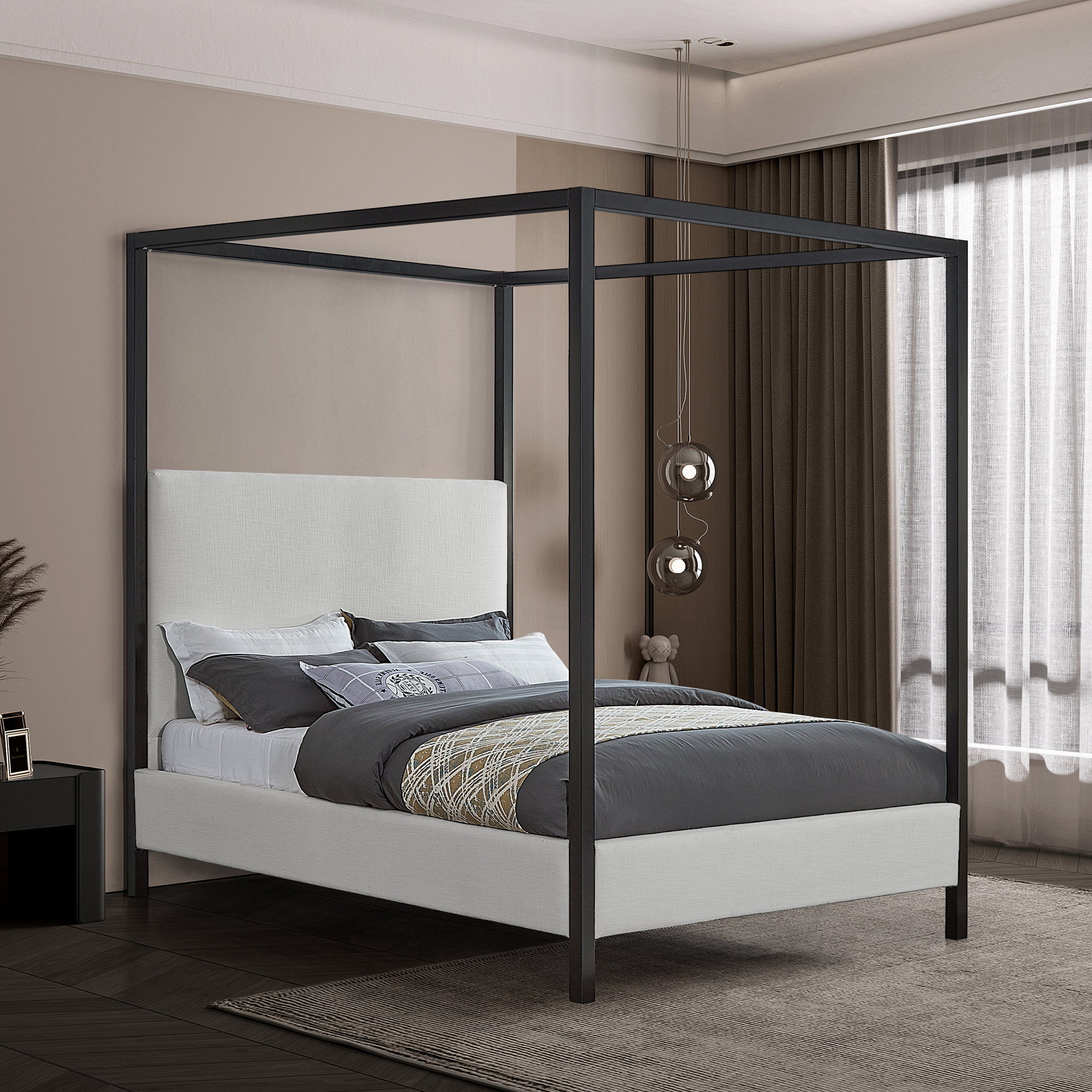 Ce magnifique lit est doté d'un baldaquin en acier qui lui confère une grande durabilité et une excellente résistance. Sa finition noire mate contraste élégamment avec le revêtement en polyester couleur crème, semblable à du lin, qui recouvre la tête et les côtés du lit.