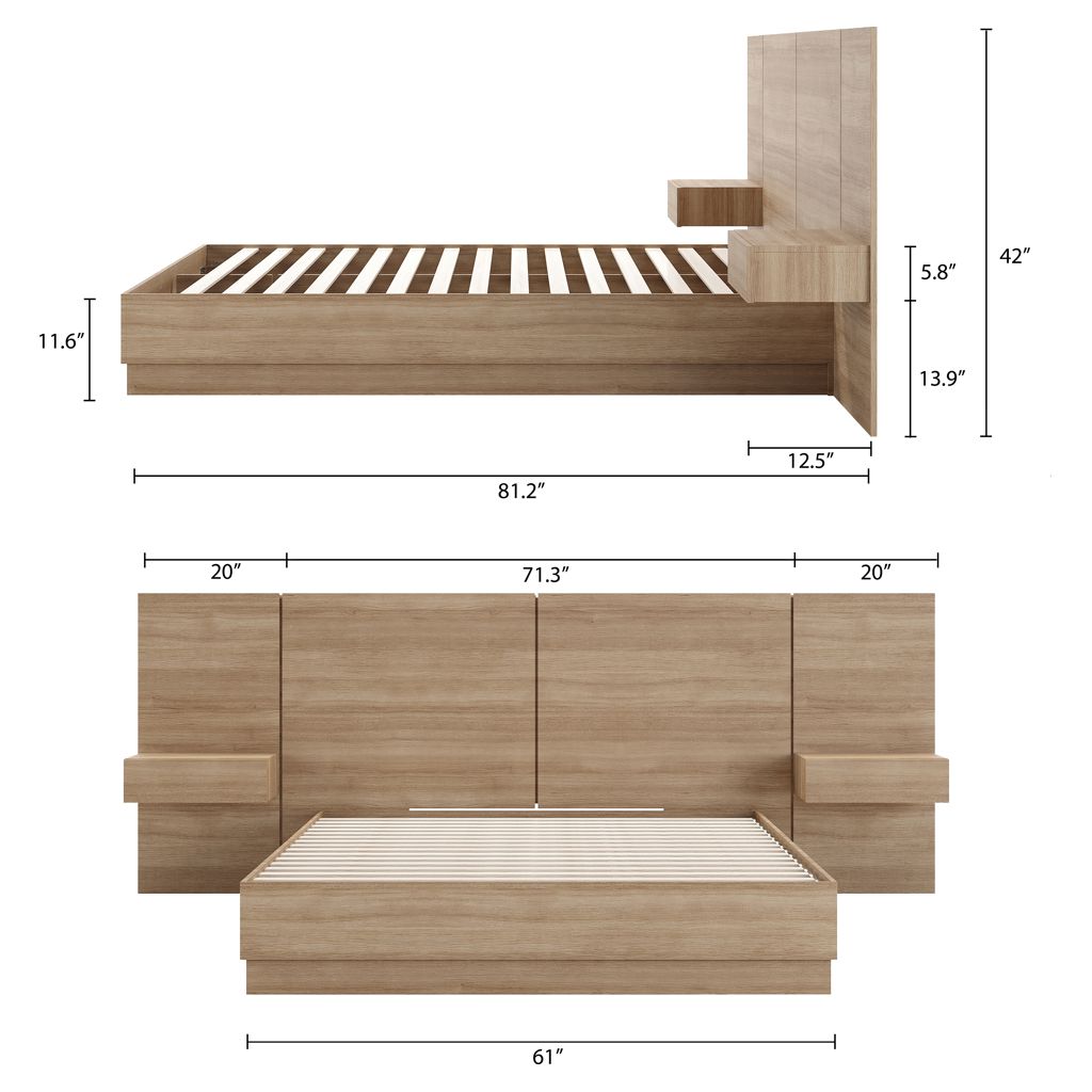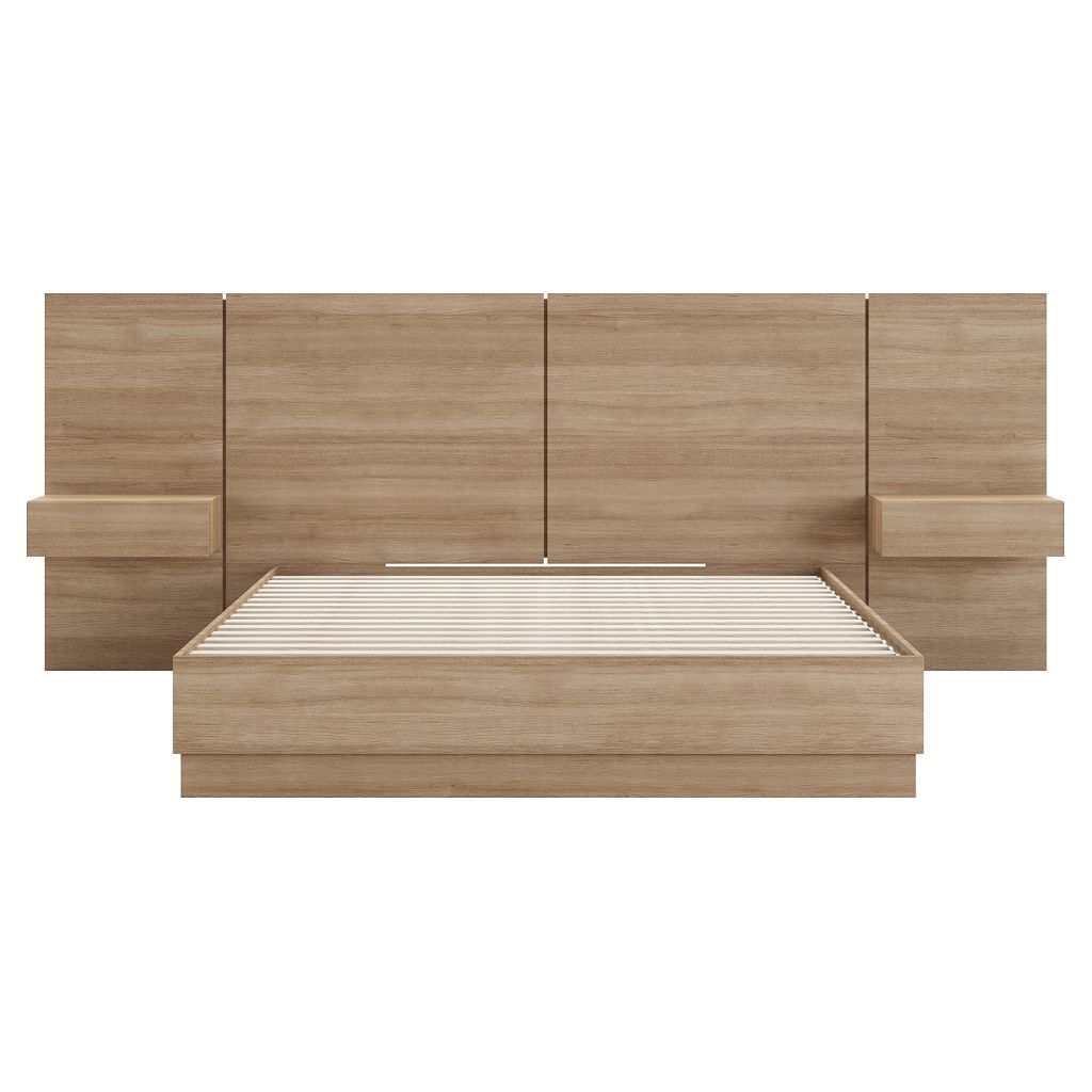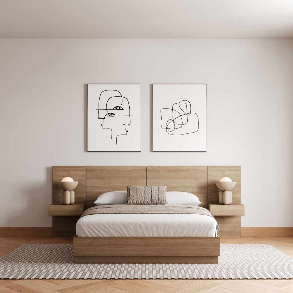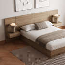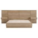 Ce lit élégant réinvente le concept du luxe, mettant en valeur une somptueuse tête de lit avec des panneaux d'extension intégrés et des tables de chevet flottantes, le tout accentuant la beauté exquise du chêne naturel.