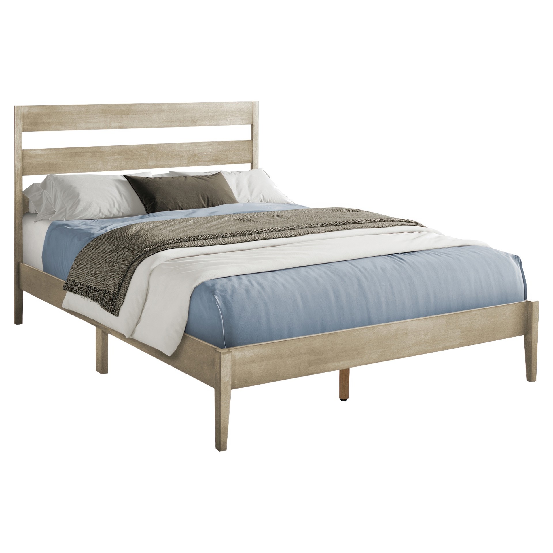 Transformez votre chambre en un sanctuaire élégant avec notre lit plateforme tendance de taille queen en gris. La construction solide de ce cadre de lit présente un cadre en bois d'ingénierie robuste, avec une tête de lit en panneau horizontal à lattes et des pieds en bois massif gris pour un look moderne et épuré.