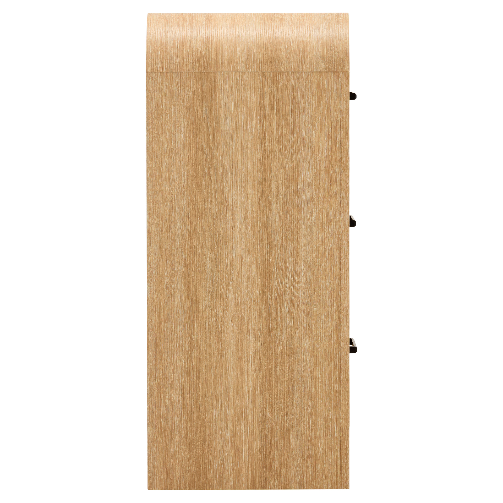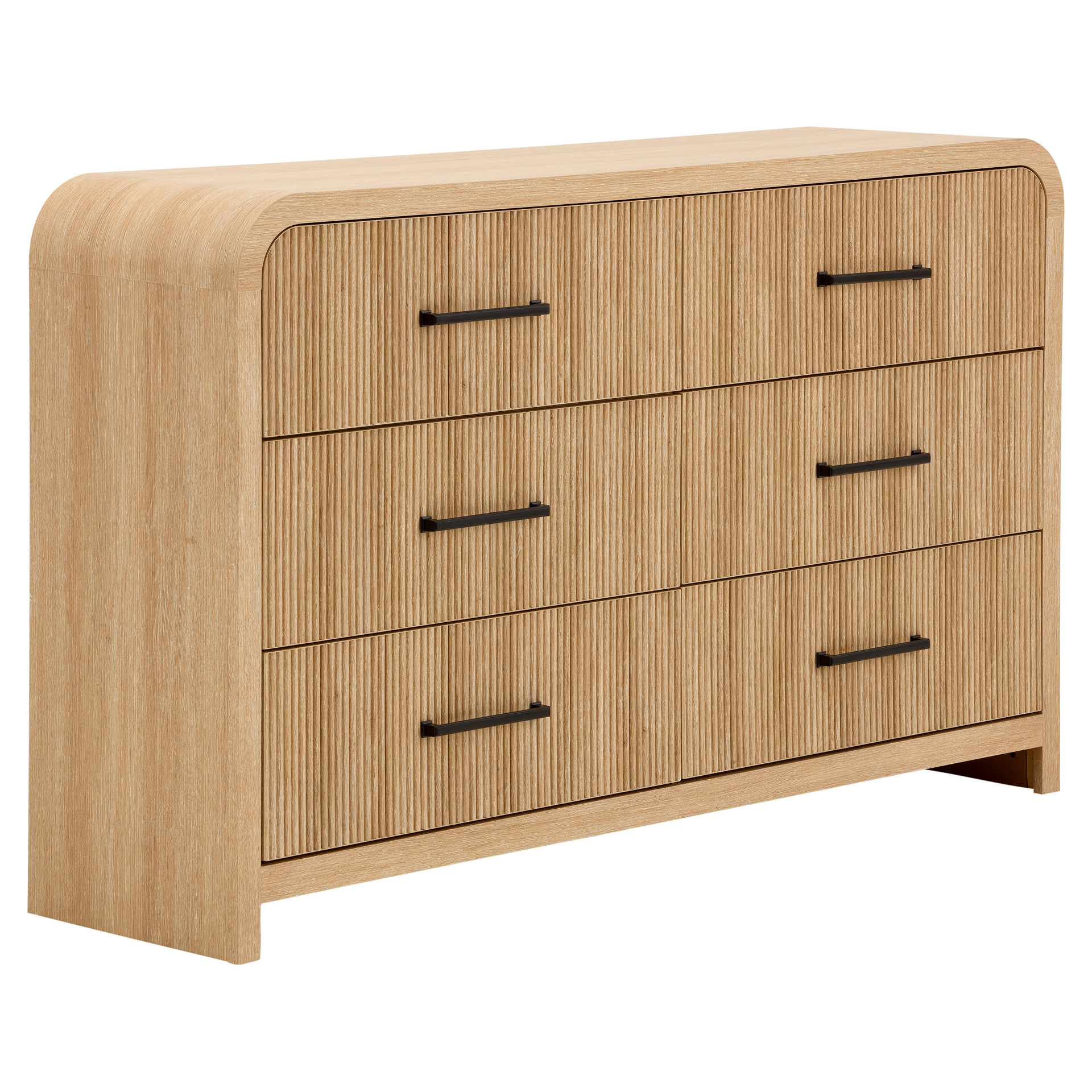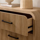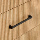 Dotée de glissières de tiroirs à roulement à billes pour un fonctionnement en douceur et d'un placage en papier pour une finition sophistiquée, cette commode se distingue par ses panneaux nervurés et ses élégantes ferrures en métal noir.