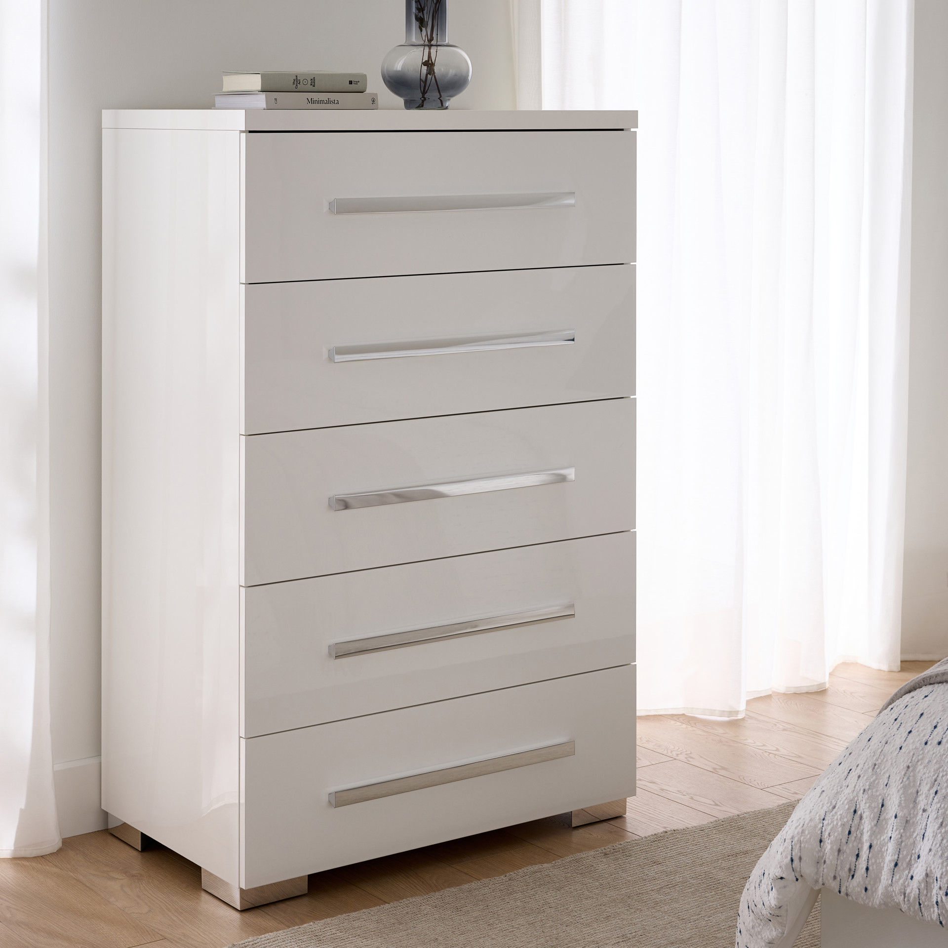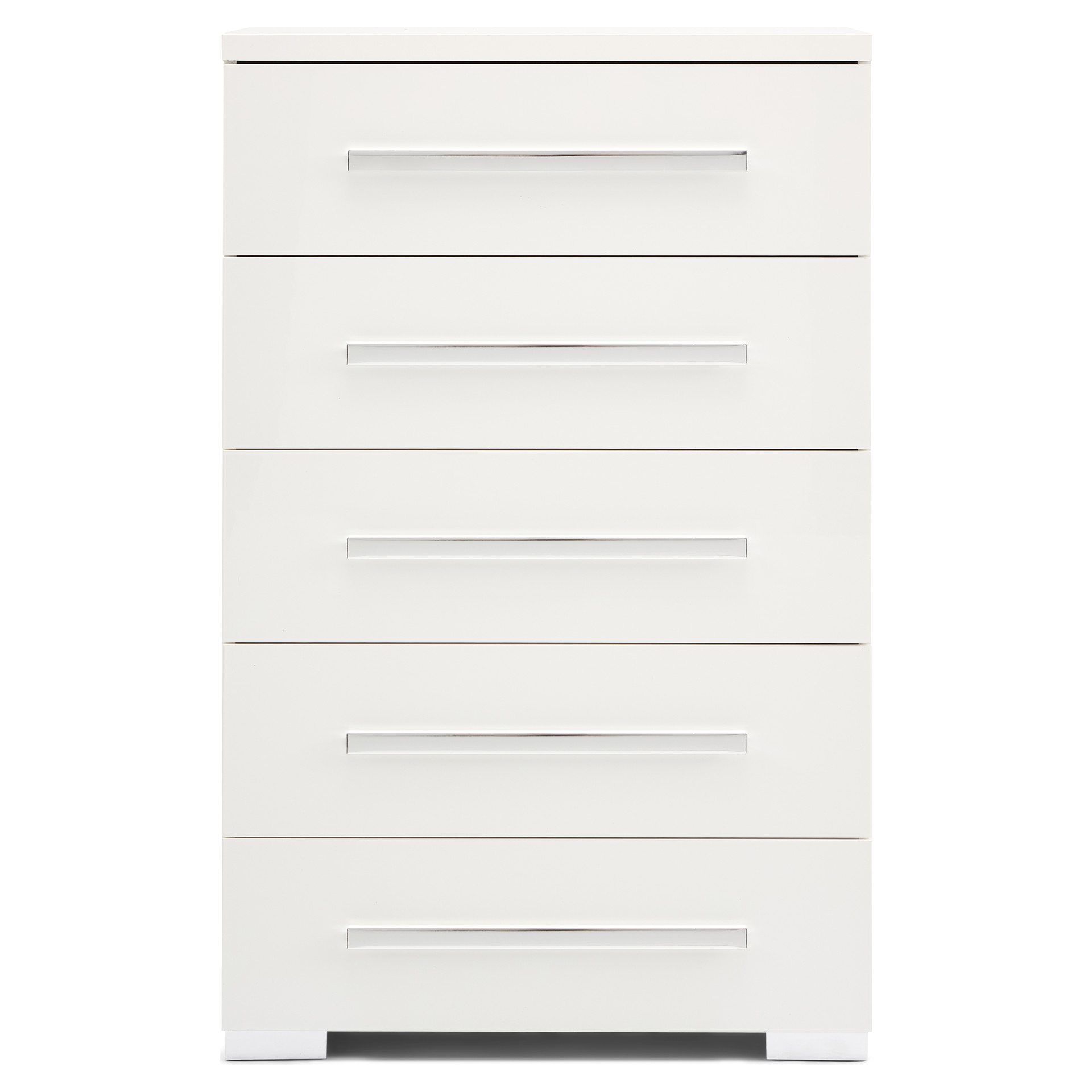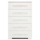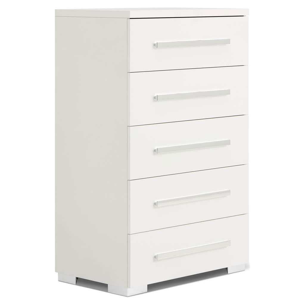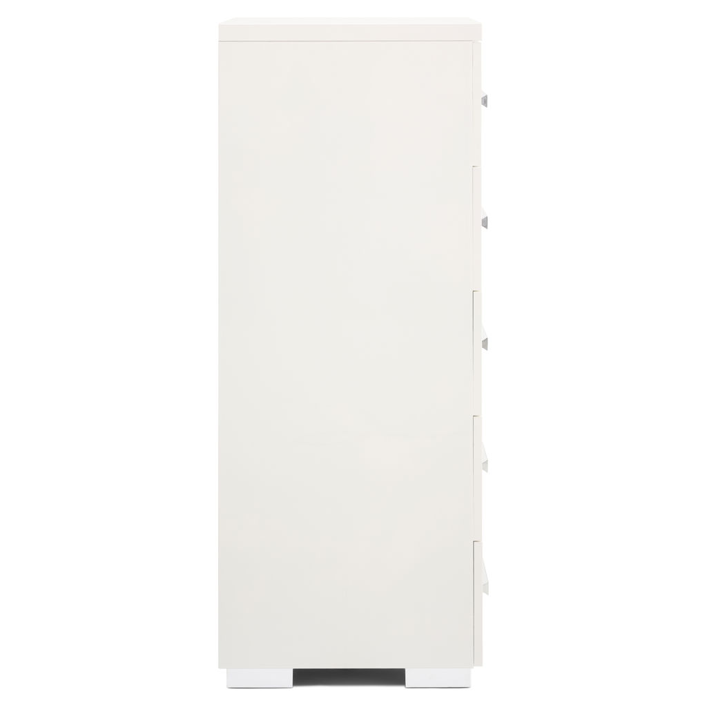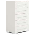 Cette commode allie design épuré et praticité au quotidien. Ses cinq tiroirs spacieux offrent un rangement généreux pour votre garde-robe, tandis que sa finition blanche immaculée s'intègre harmonieusement à tout décor.