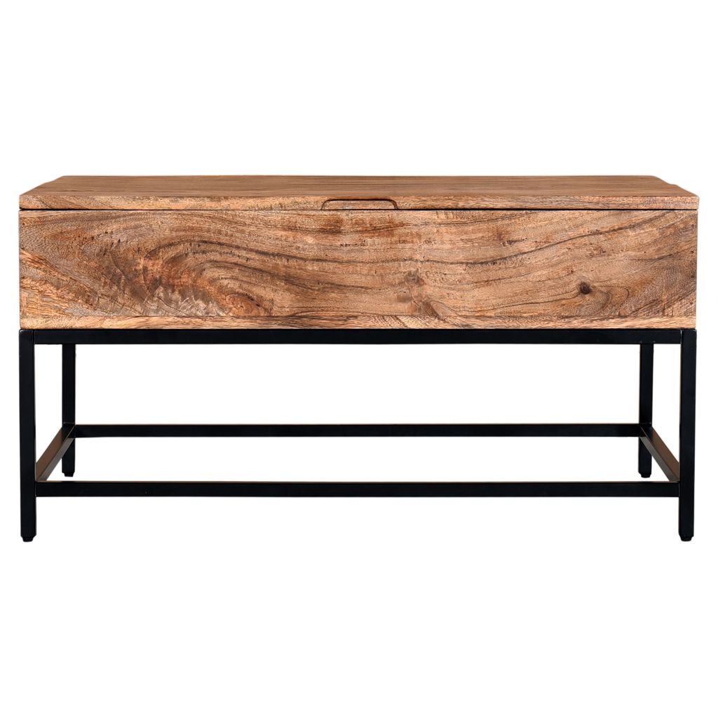 Ce meuble rustique et moderne est muni d'un compartiment de rangement avec un couvercle basculant qui offre un espace spacieux, pour ranger une variété d'articles que vous souhaitez tout de même avoir à portée de la main, comme des couvertures, consoles de jeux, télécommandes, jeux de société et albums photos.