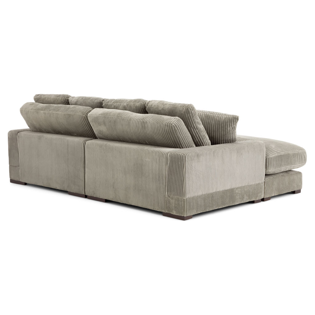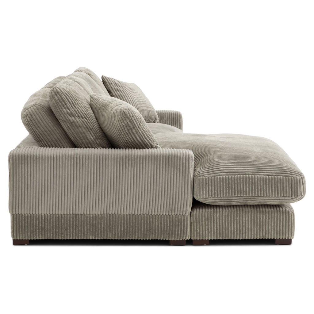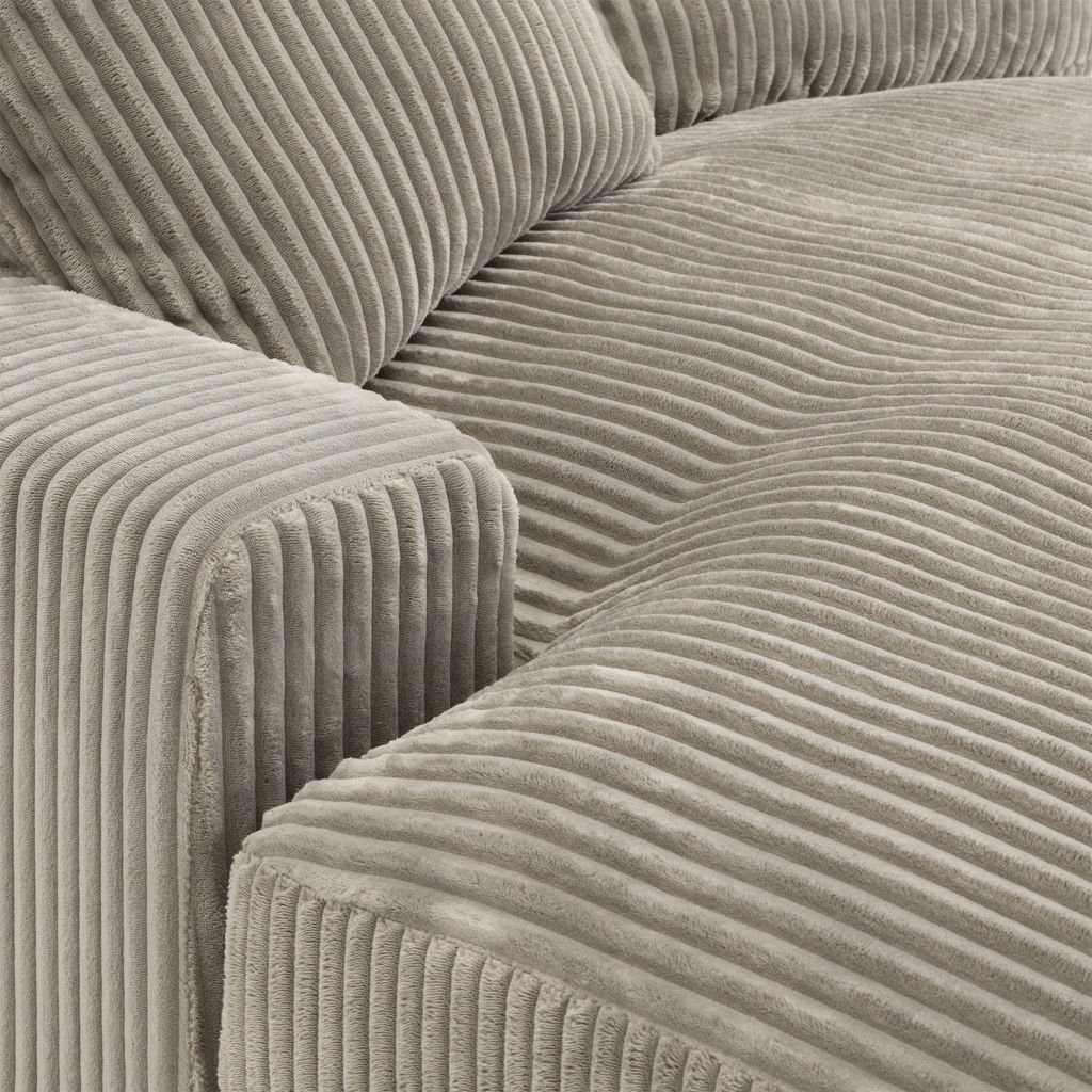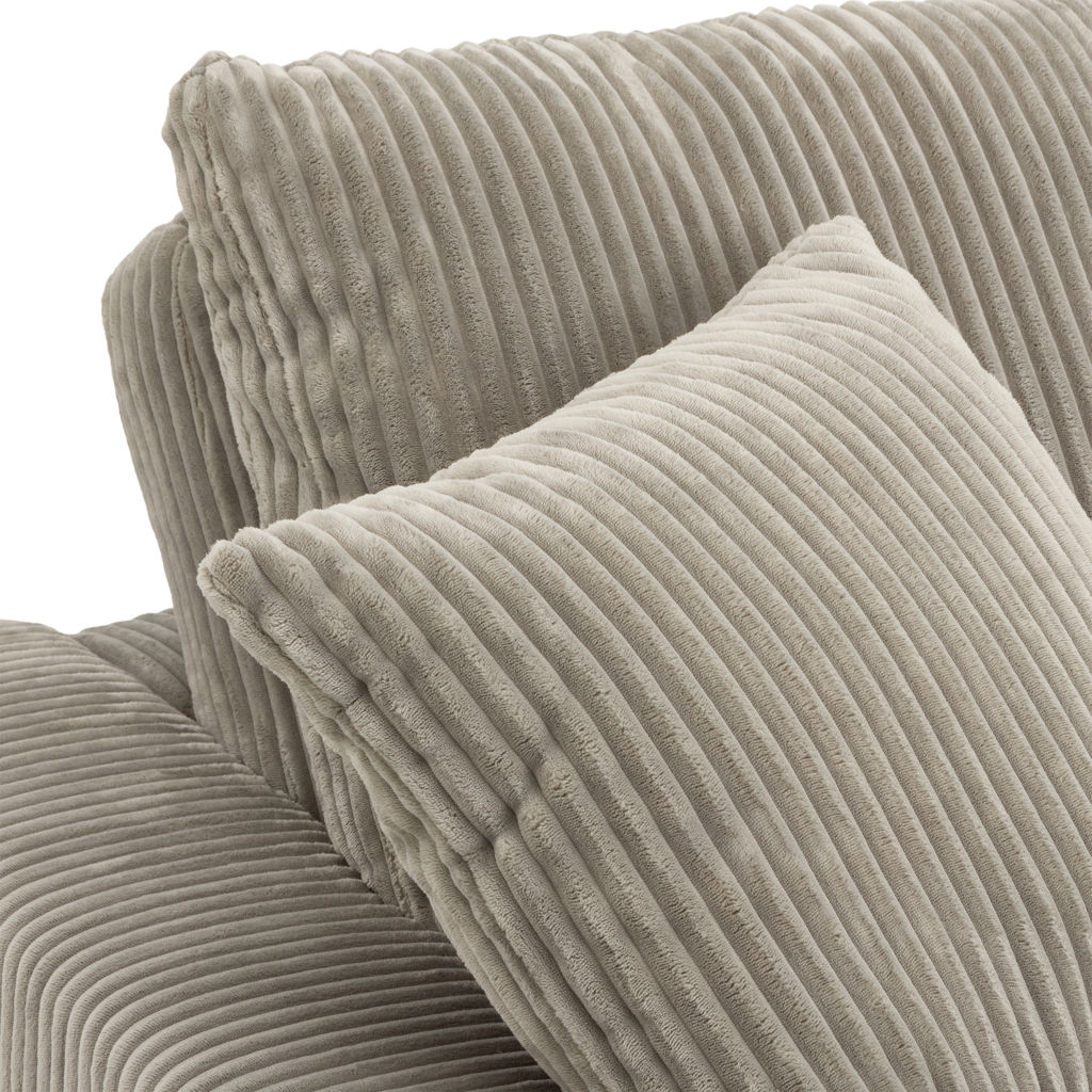 Recouvert d’un doux tissu côtelé gris brun, il invite à la détente grâce à ses coussins généreusement rembourrés et ses deux coussins décoratifs assortis.