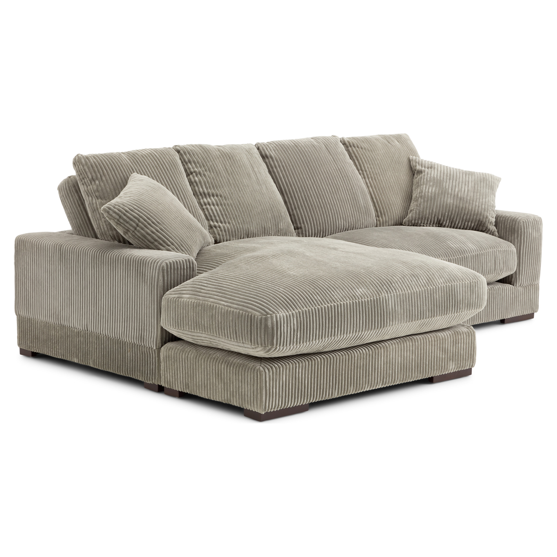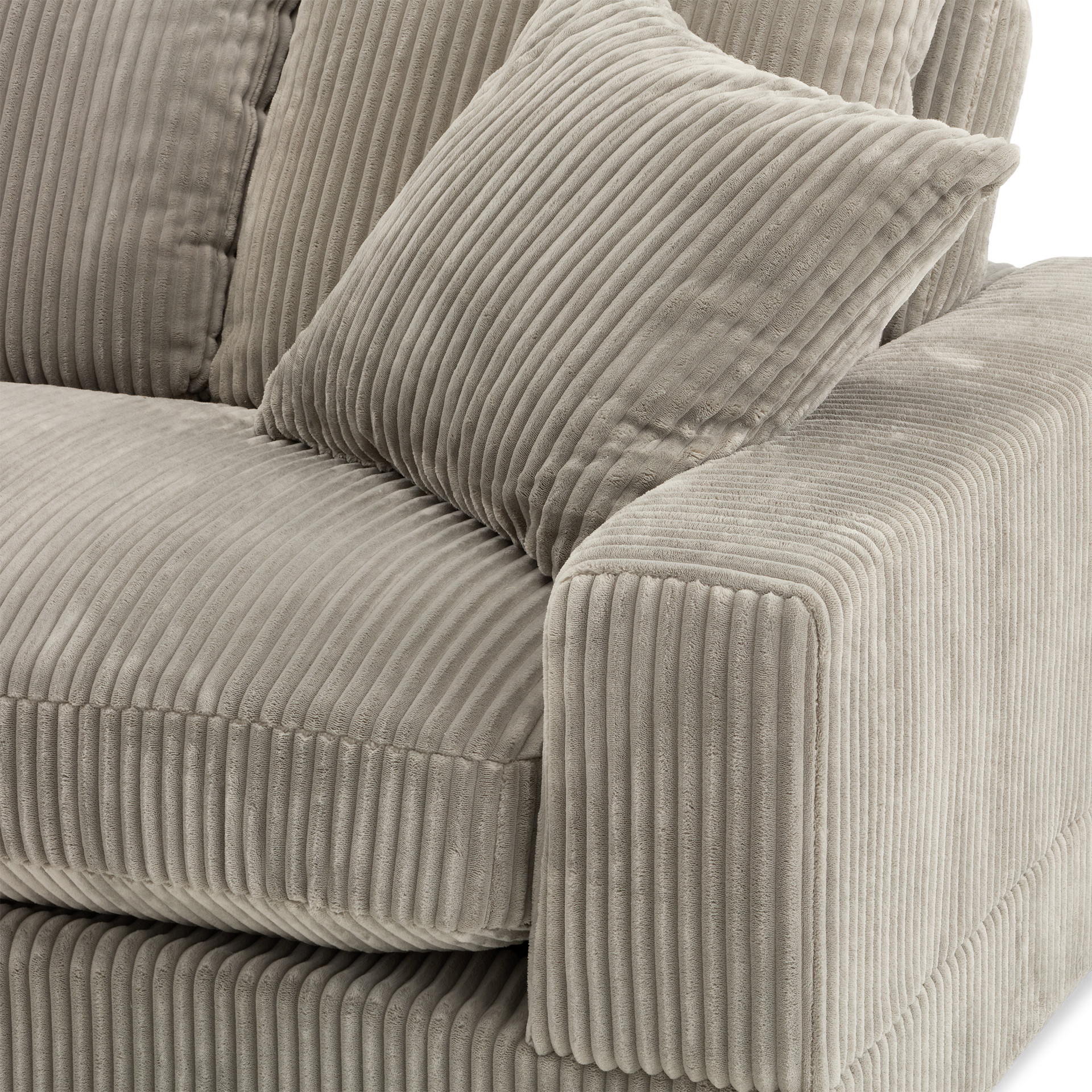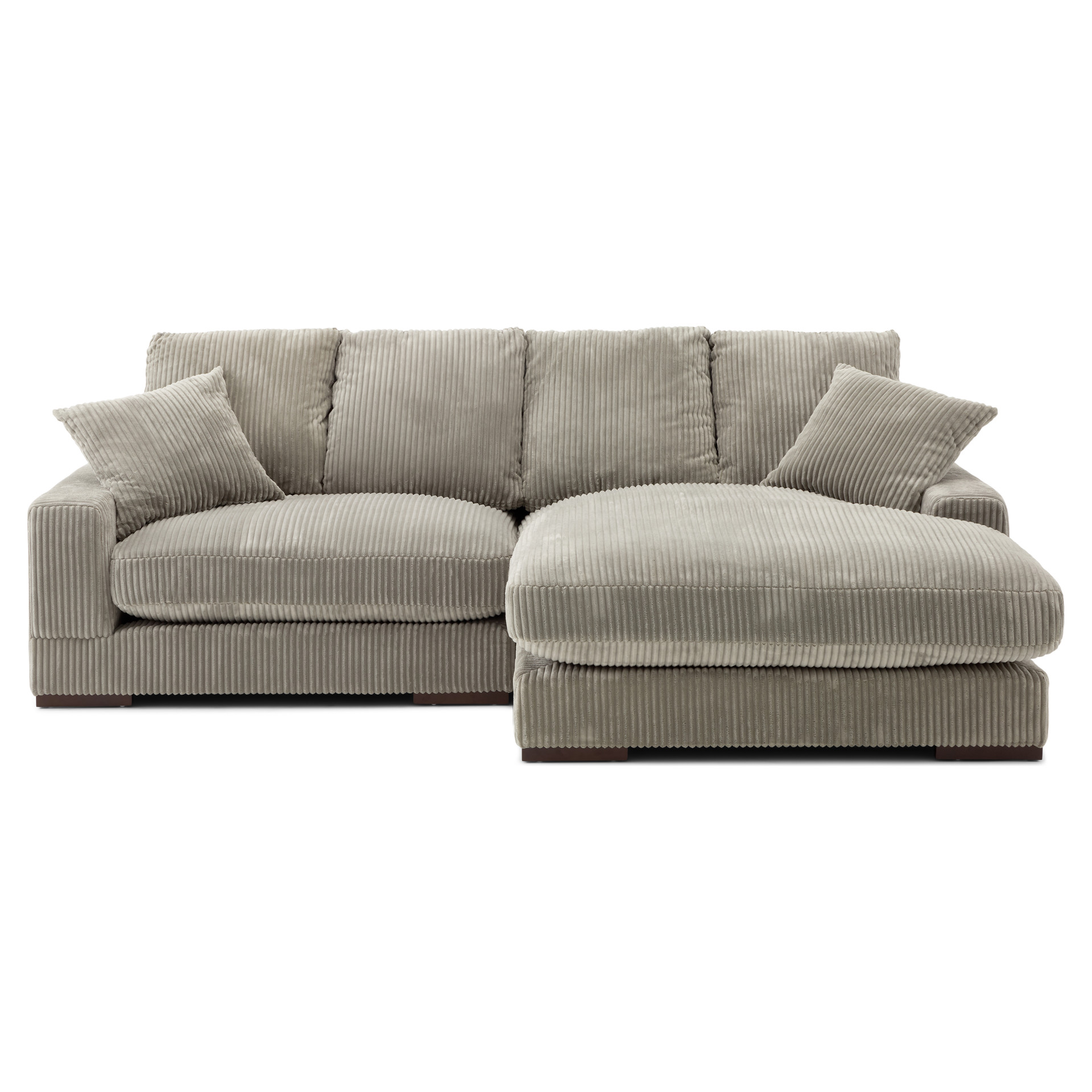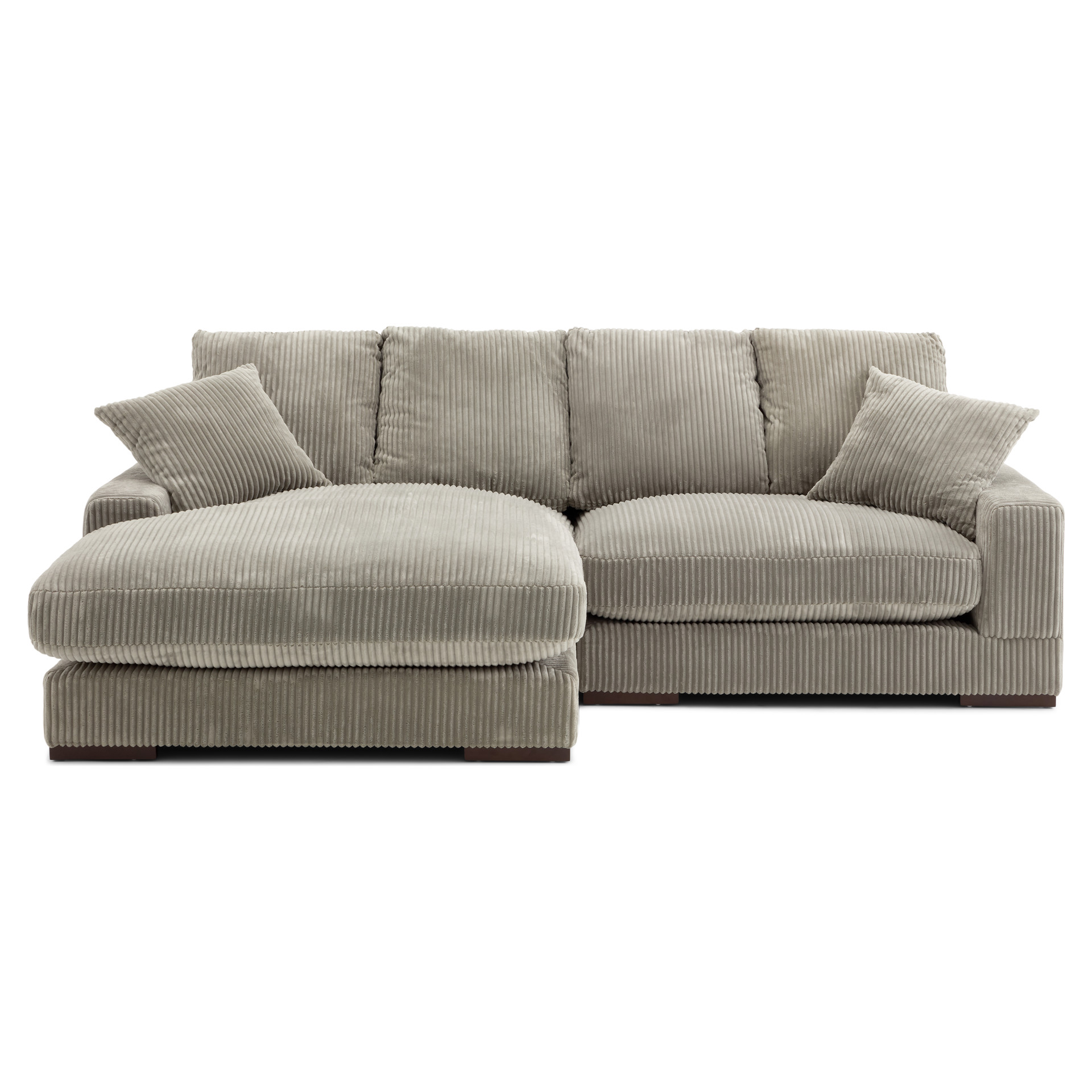 Recouvert d’un doux tissu côtelé gris brun, il invite à la détente grâce à ses coussins généreusement rembourrés et ses deux coussins décoratifs assortis.