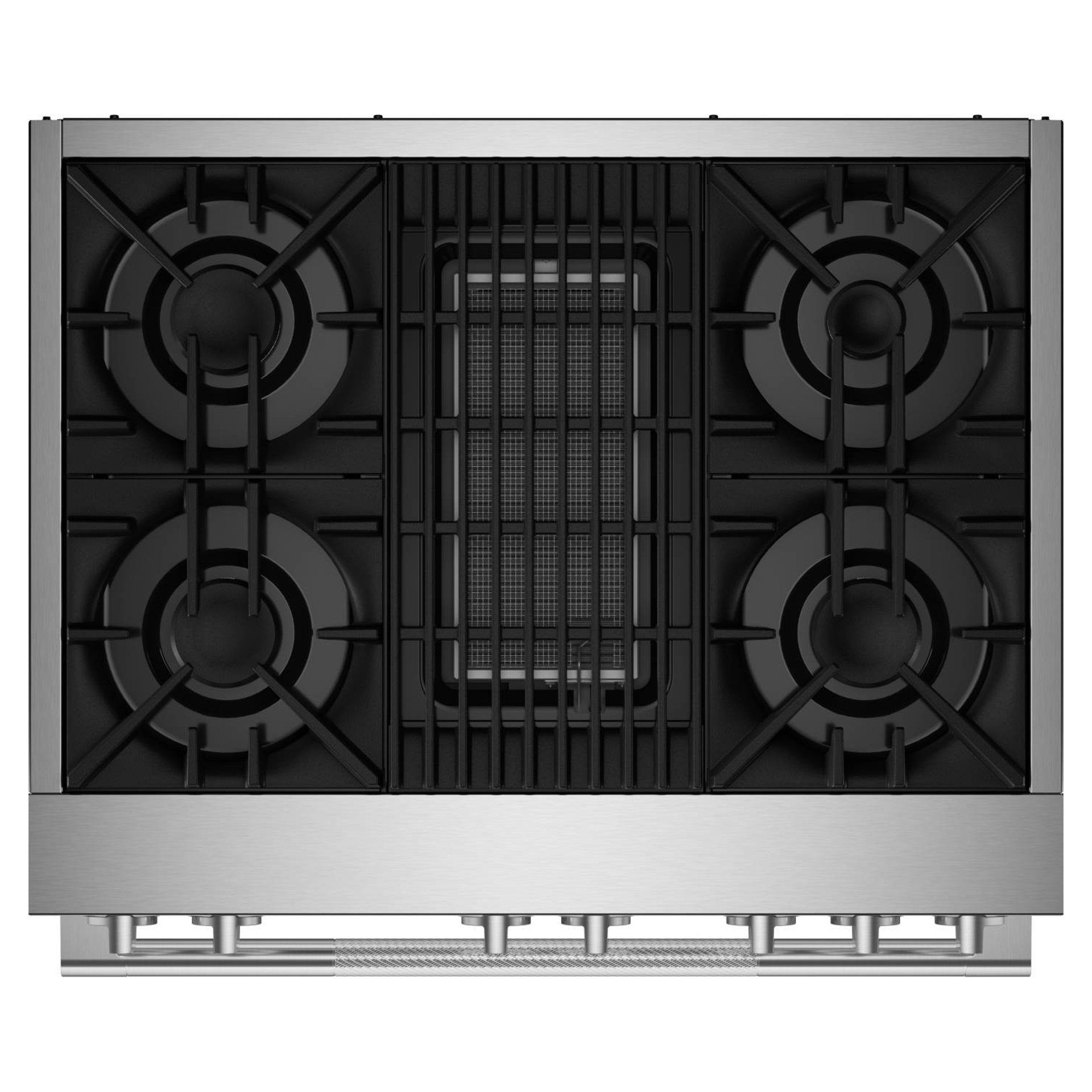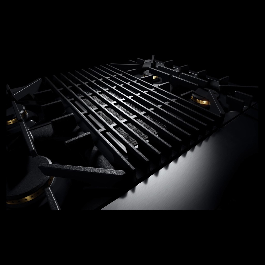 Des grilles géométriques robustes forment une surface élégante, conçue pour résister aux woks et batteries de cuisine lourdes.