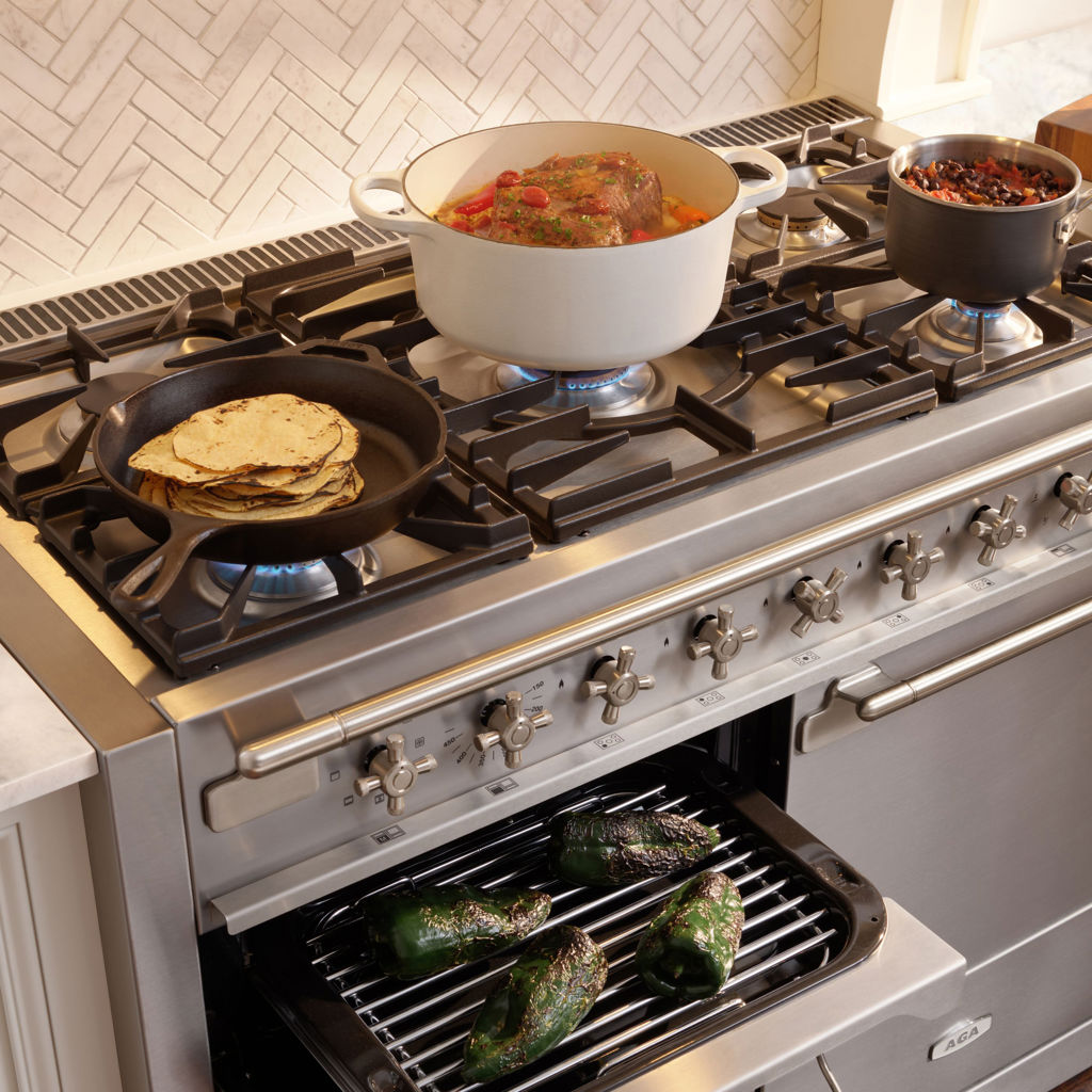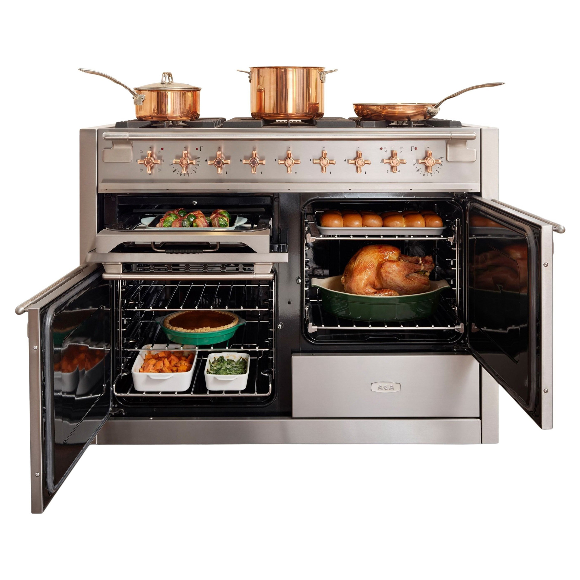 Le modèle à combustible mixte AGA Elise de 48 po comprend trois fours distincts. Le premier est un four électrique multifonction avec sept réglages, dont la véritable cuisson à double convection européenne, la cuisson à convection assistée, le brunissement, la décongélation et le service, la cuisson au gril par convection, le réchauffage et la cuisson conventionnelle.
