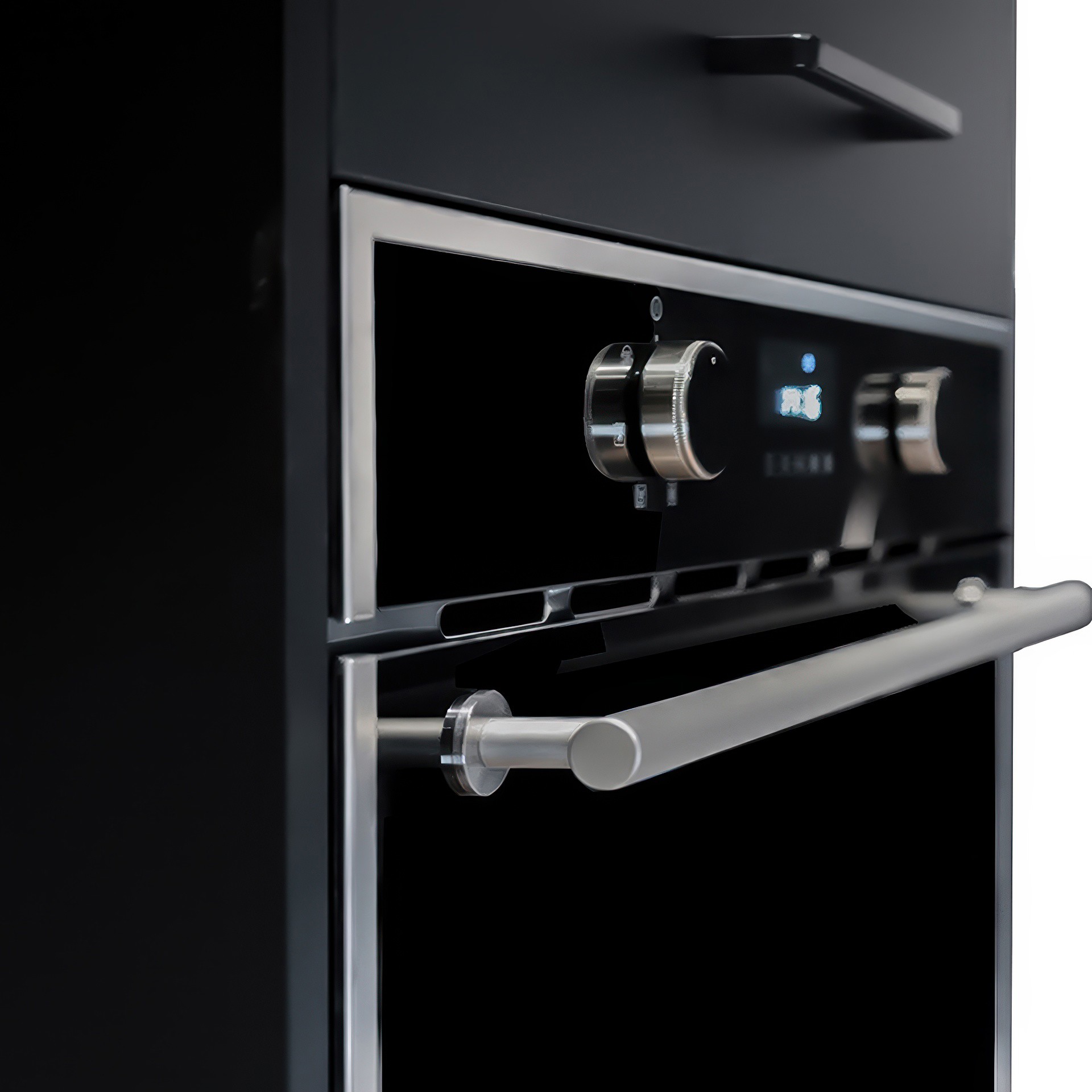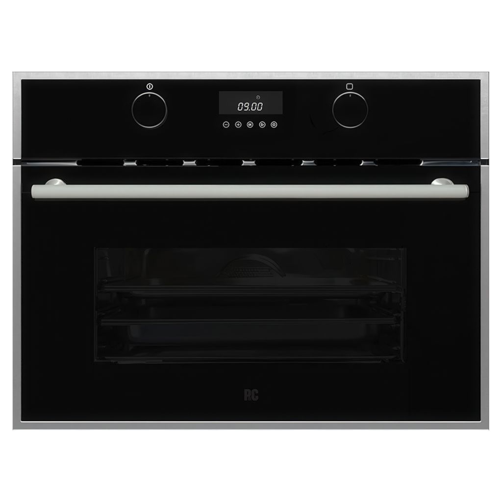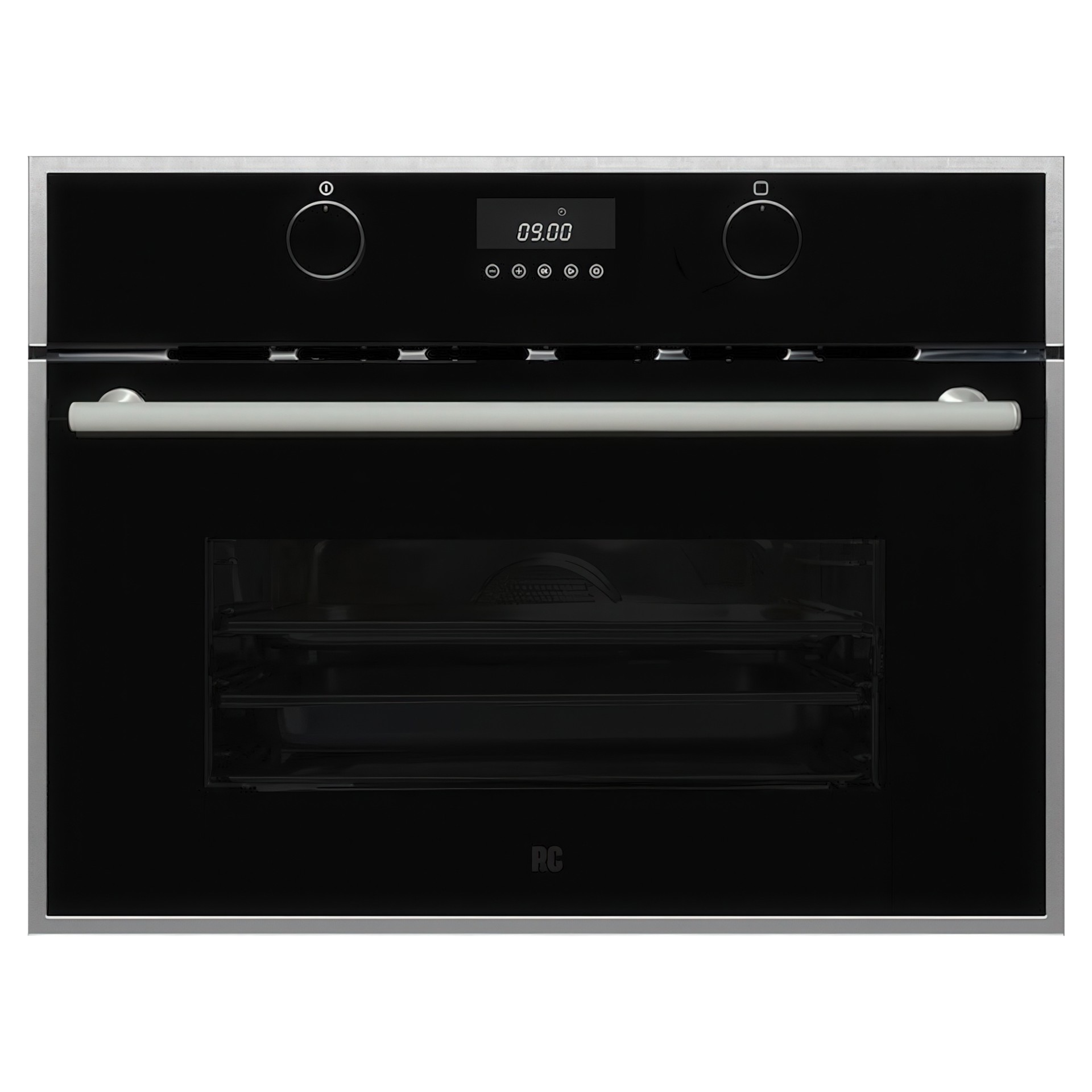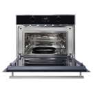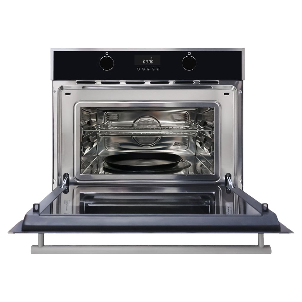 Four à cuisson rapide compact intégré de 24 po (60 cm), hauteur de 45 cm, capacité intérieure de 38 L (1,34 pi³), inclus la fonction four à micro-ondes de 1 000 W plus gril et ventilateur à convection. 6 fonctions de cuisson : micro-ondes, gril, micro-ondes + gril, micro-ondes + convection, convection, gril + chaleur tournante ; Plus 3 fonctions de cuisson automatique, acier inoxydable résistant aux traces de doigts, intérieur en acier inoxydable, affichage numérique avec commandes rétractables et horloge/minuterie numérique entièrement programmable, fonction de mémoire pour les recettes préférées, verre noir avec garniture en acier inoxydable.