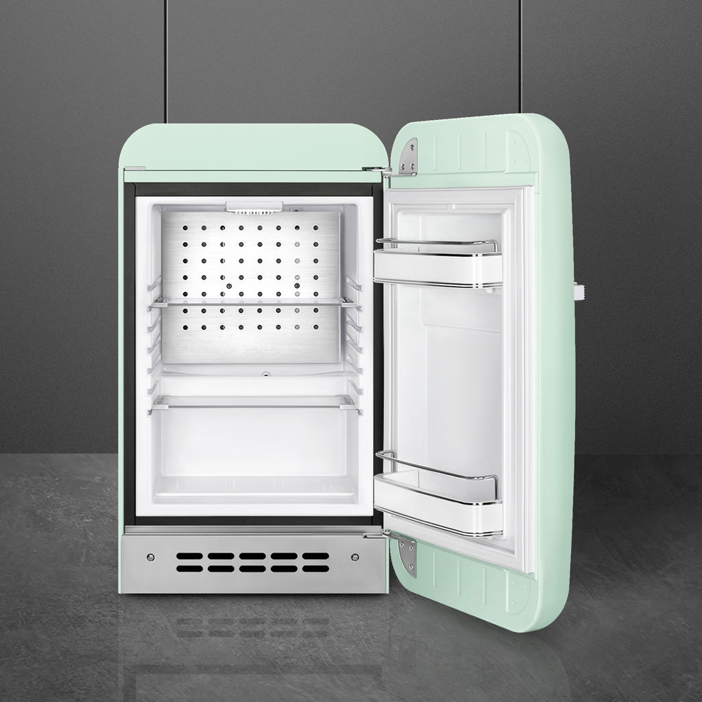 Disponibles dans différentes tonalités de couleur allant d'une crème subtile à un vert vibrant, les réfrigérateurs compacts de style rétro des années 50 de couleur SMEG sont vraiment emblématiques.