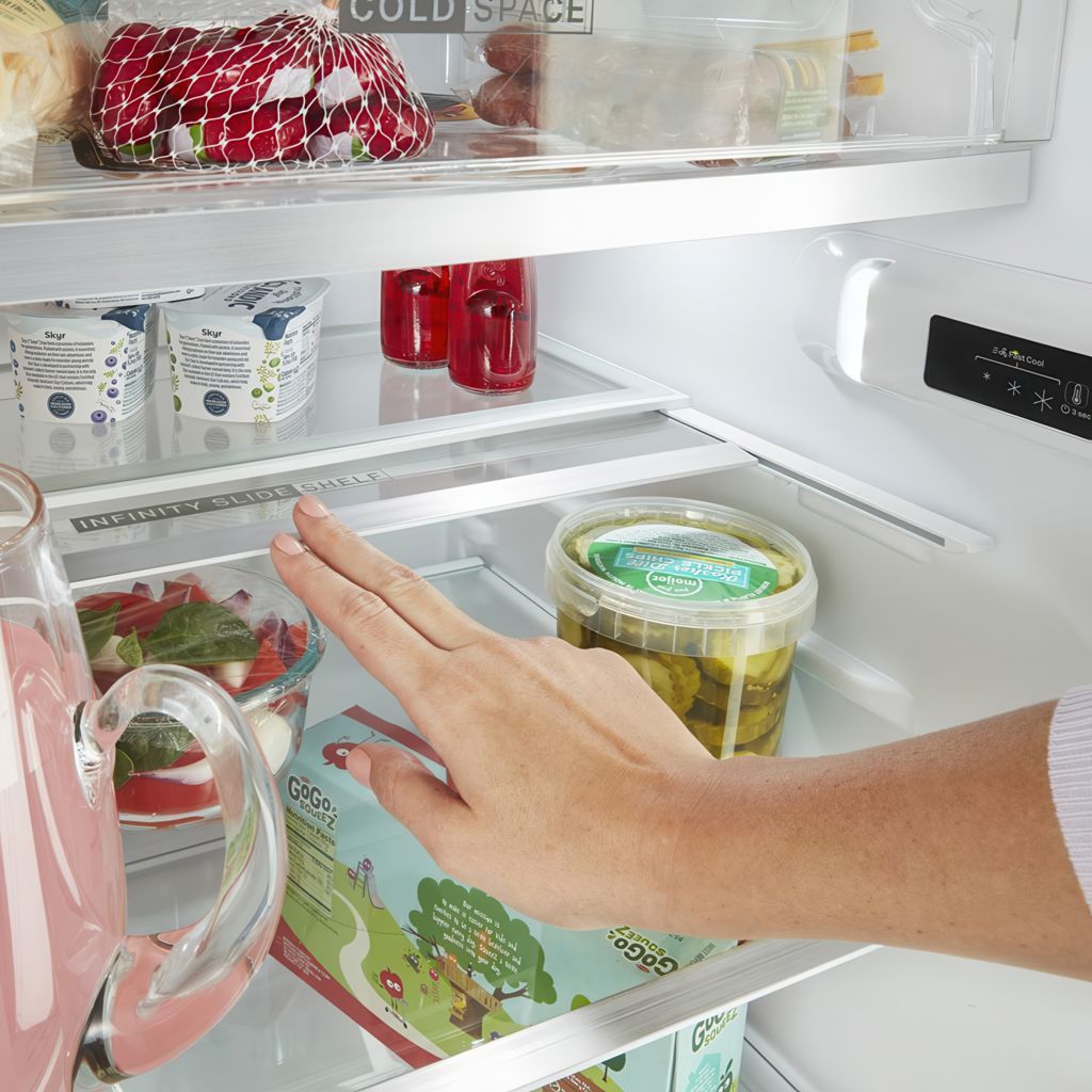 Des tablettes de rangement flexibles et un bac de porte d’un gallon vous aident à ranger vos favoris dans les petits espaces, tandis que l’étagère coulissante Infinity fait de la place pour les articles de grande taille.