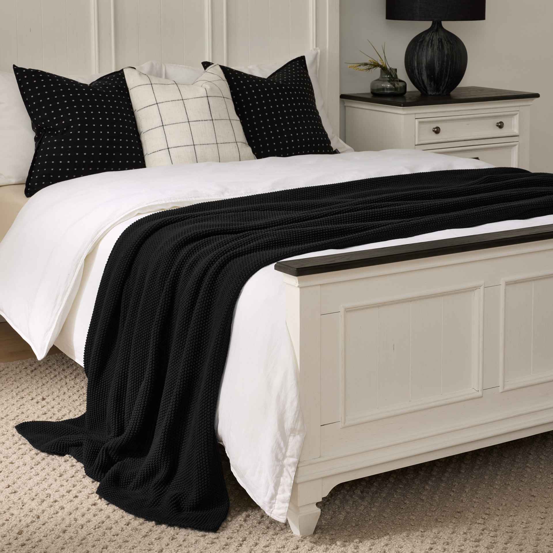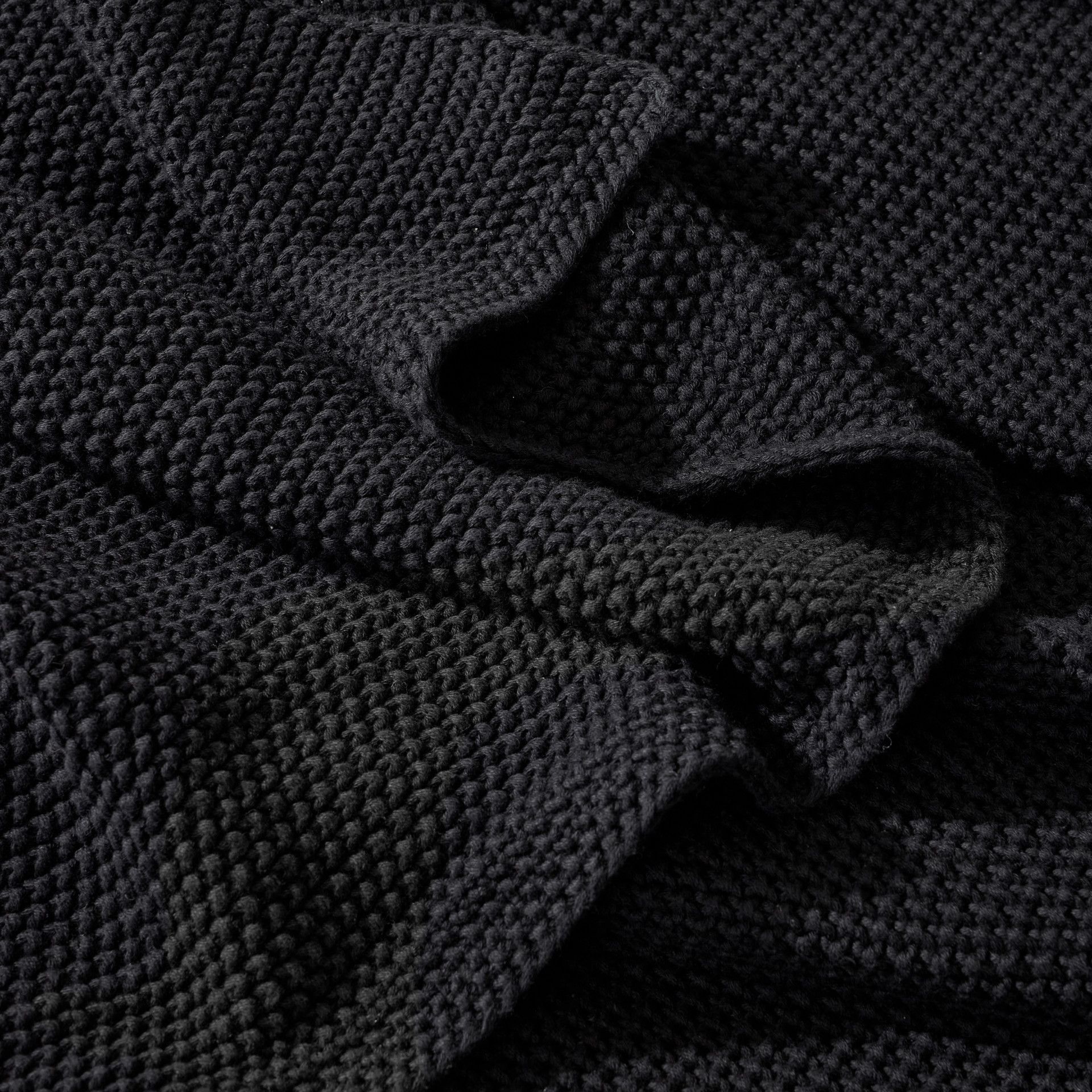 Couverture en tricot noir. 100% coton. Lavable et séchable à la machine. Grandeur double-queen.
