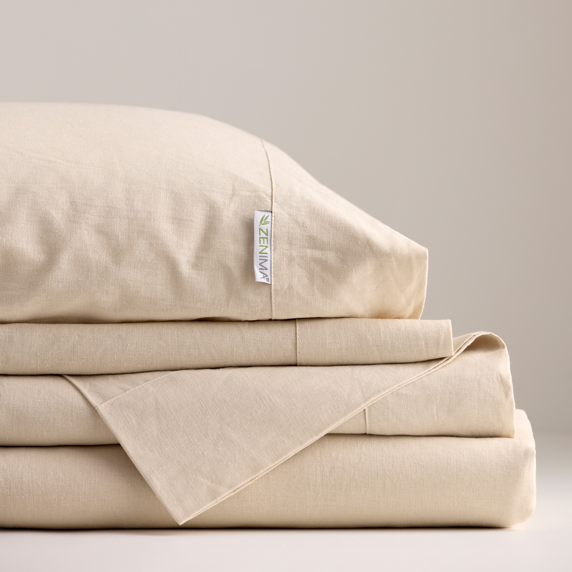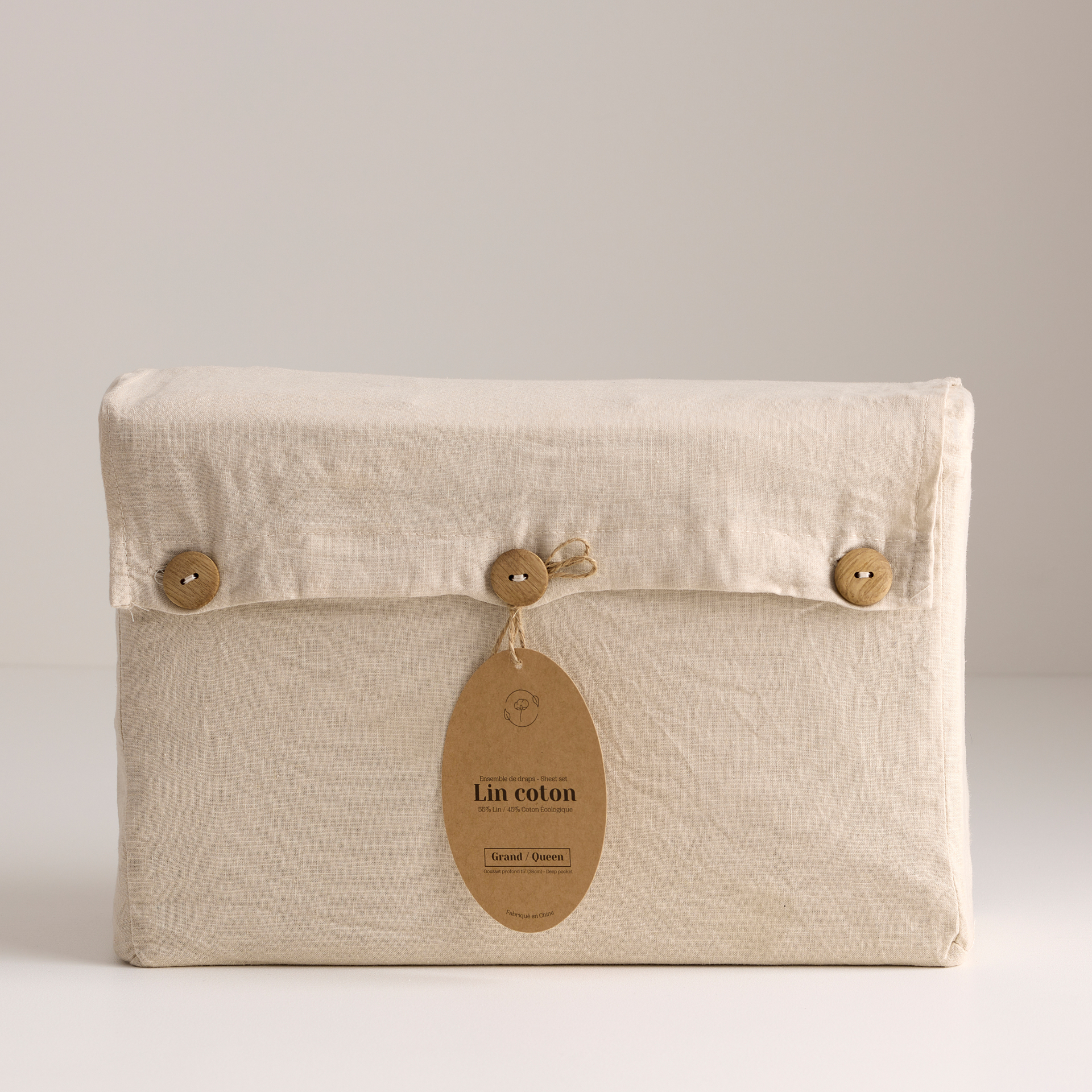 Draps 55% Lin / 45% Coton biologique 300 Fils au pouce. Teinture naturelle à base d'enzymne de plante. Comprend 1 drap plat, 1 drap contour et 2 taies. Emballés dans un sac confectionné dans le même tissu.