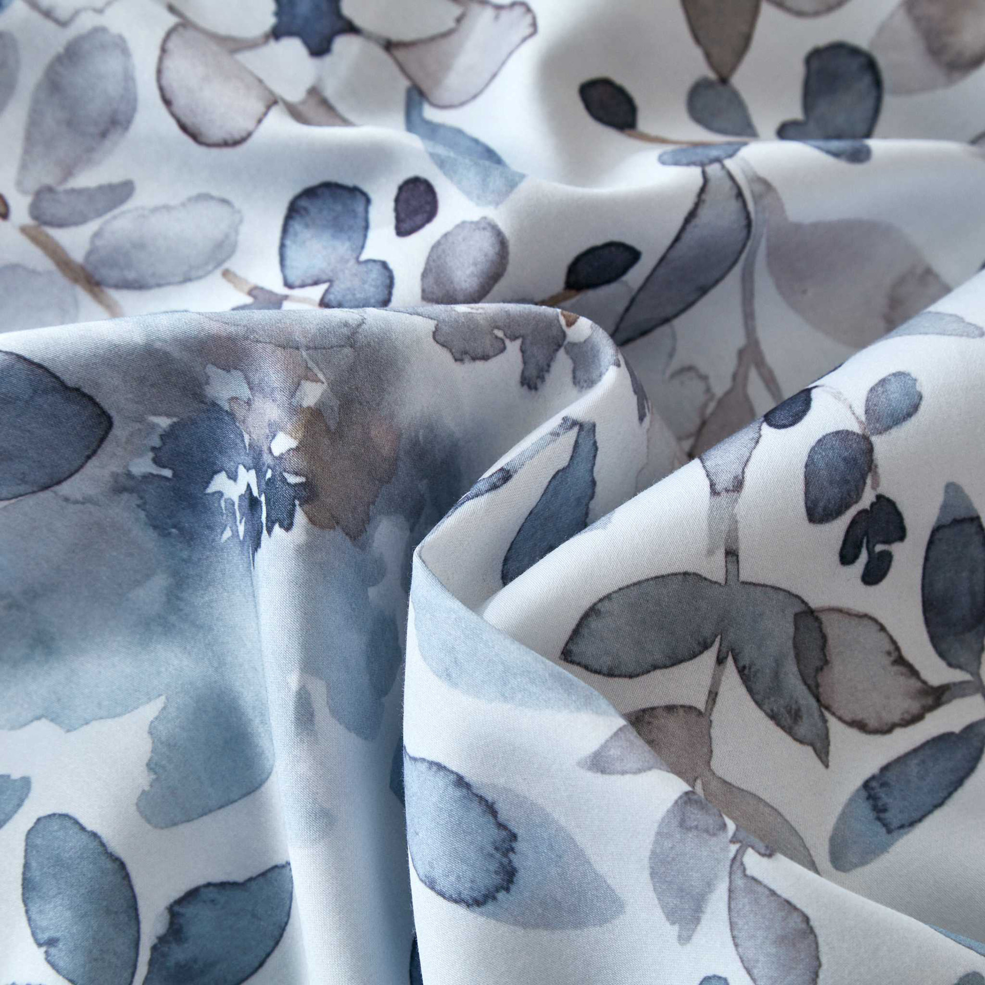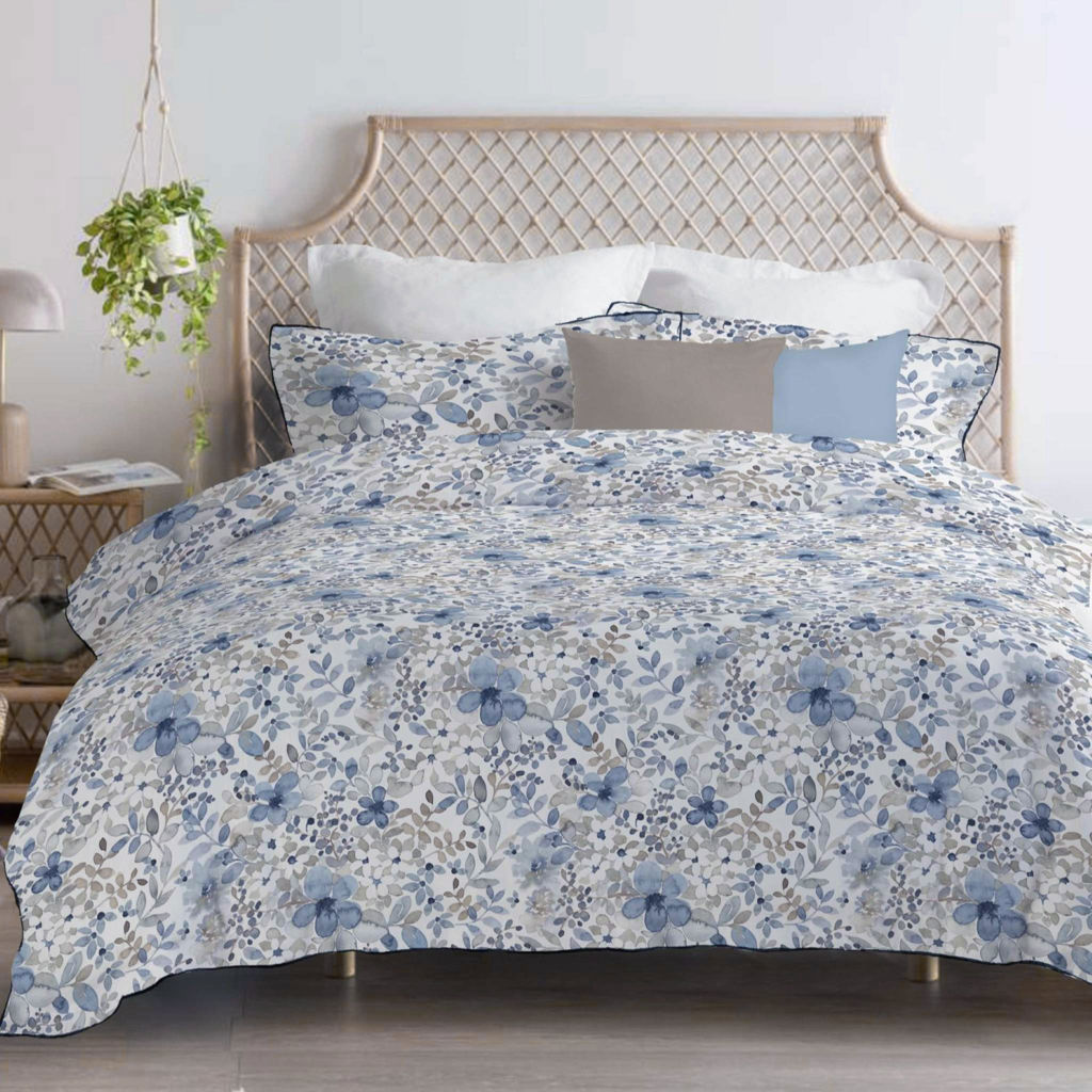 Le motif présente une aquarelle florale sereine avec ses doux tons de bleu, rehaussée de touches de gris et de moka pour un effet visuel apaisant. Fini avec une bordure en biais de couleur marine coordonnée, Brume florale est à la fois raffinée et décontractée.
