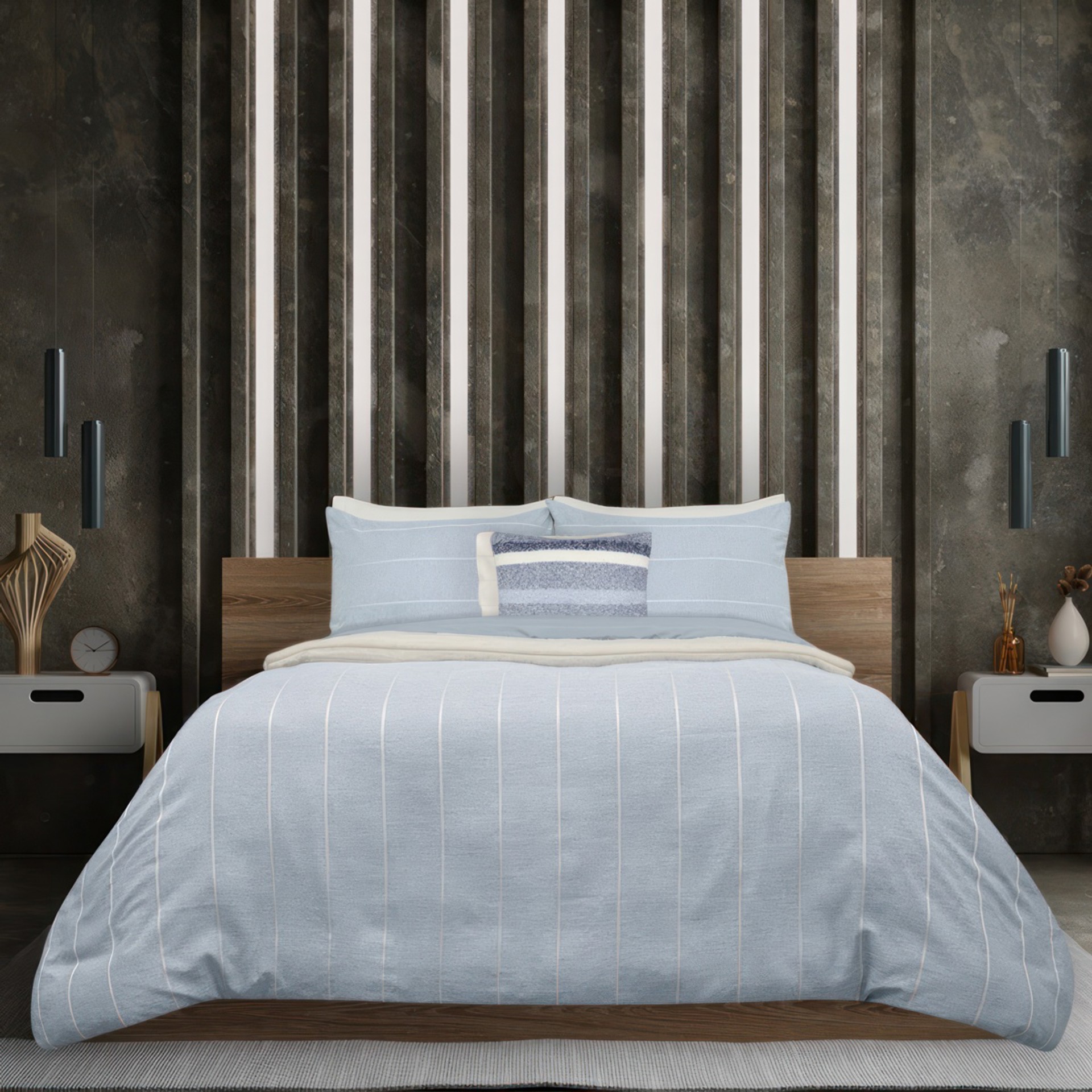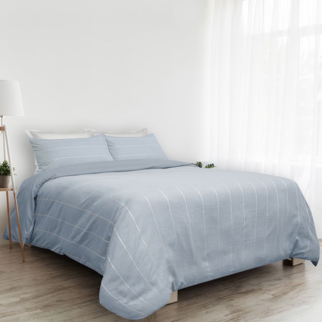 Ensemble de housse de couette lit Simple (twin) et 1 cache oreiller Sutherland. L'ensemble est composé de 75% faux lin en polyester recyclé et 25% polyester. Réversible au bleu uni.