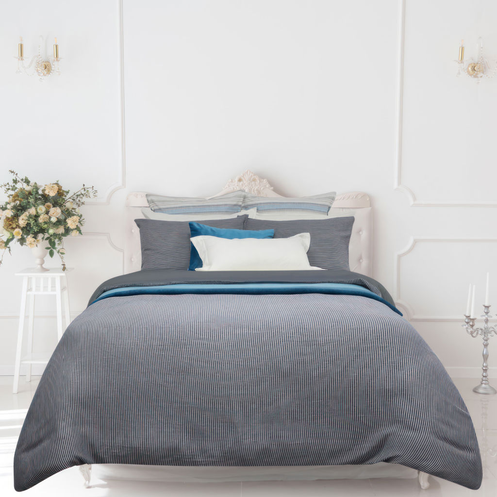 Ensemble de housse de couette Très grand lit (king) et 2 caches oreillers Promesse. Les fines rayures blanches de Promesse sur un fond cendré sont un parfait équilibre entre l'allure classique et le chic décontracté.