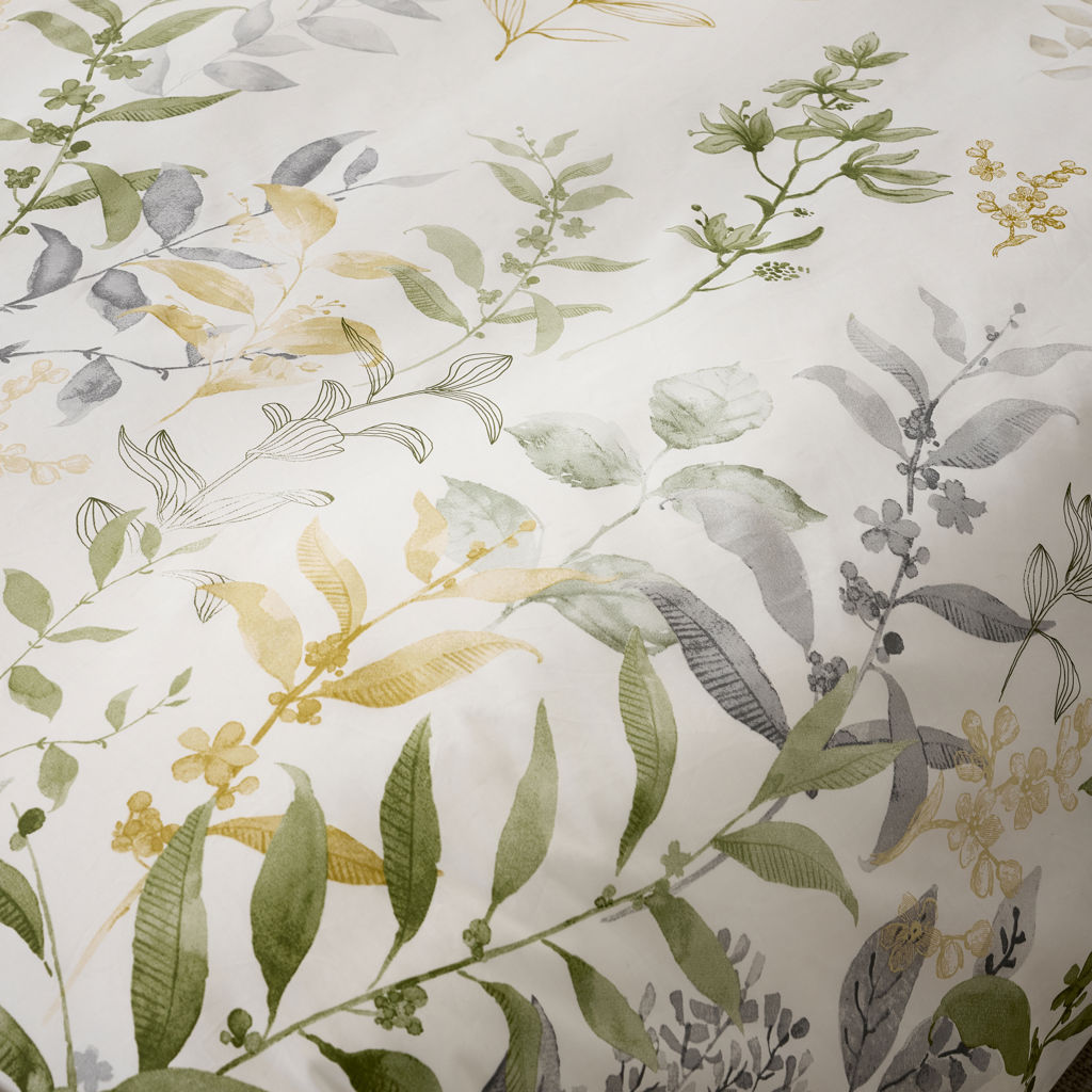 Aspen est un ensemble housse de couette et 2 taies d'oreillers inspiré de la nature avec d'élégantes feuilles vertes, dorées et grises qui s'enroulent sur un fond blanc chaud créant une ambiance calme et élégante.
