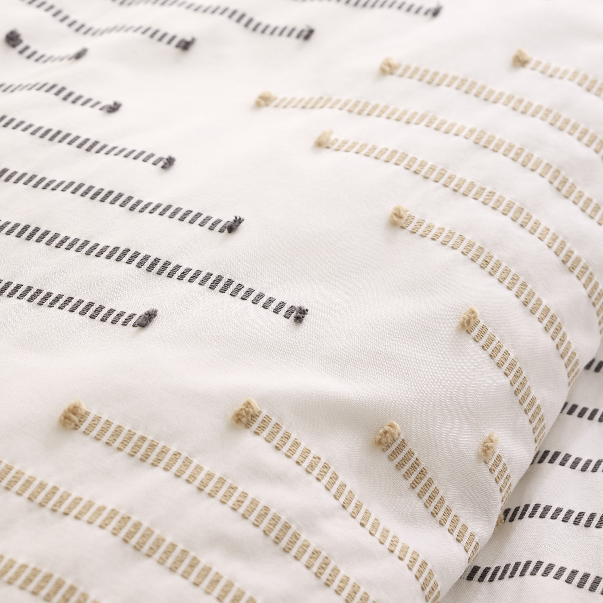 Cet ensemble vous gardera au frais et vous procurera une sensation de confort tout au long de la nuit.La broderie abstraite dans les tons de gris et beige représente des losanges sur un fond blanc.