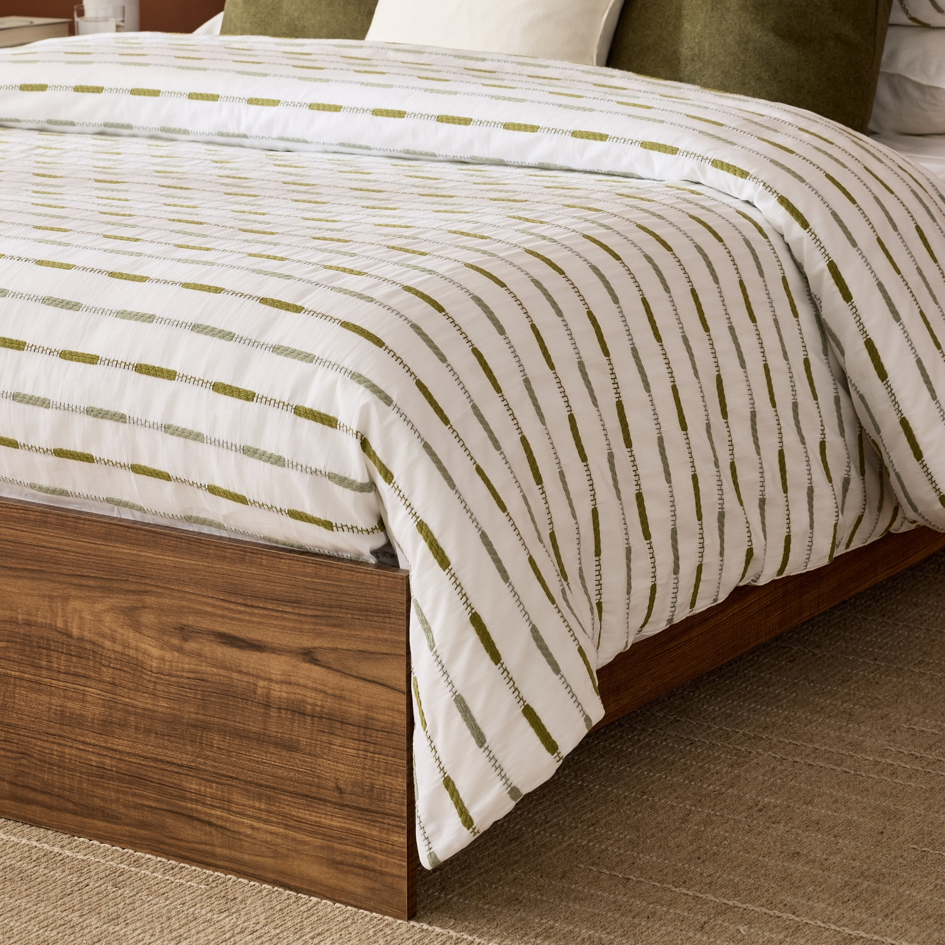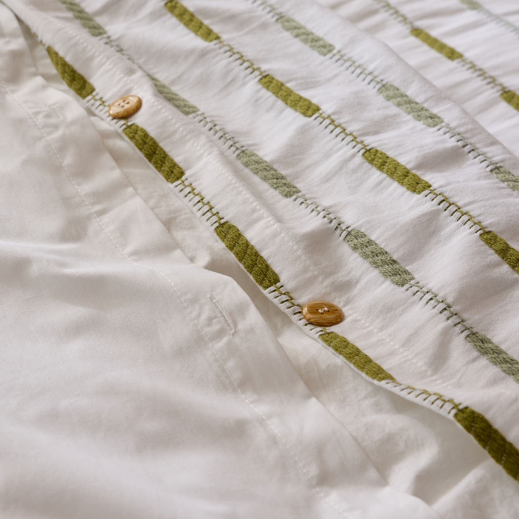 Cet ensemble vous gardera au frais et vous procurera une sensation de confort tout au long de la nuit. La broderie dans les tons de vert sauge et vert kaki représente une rayure sur fond blanc.