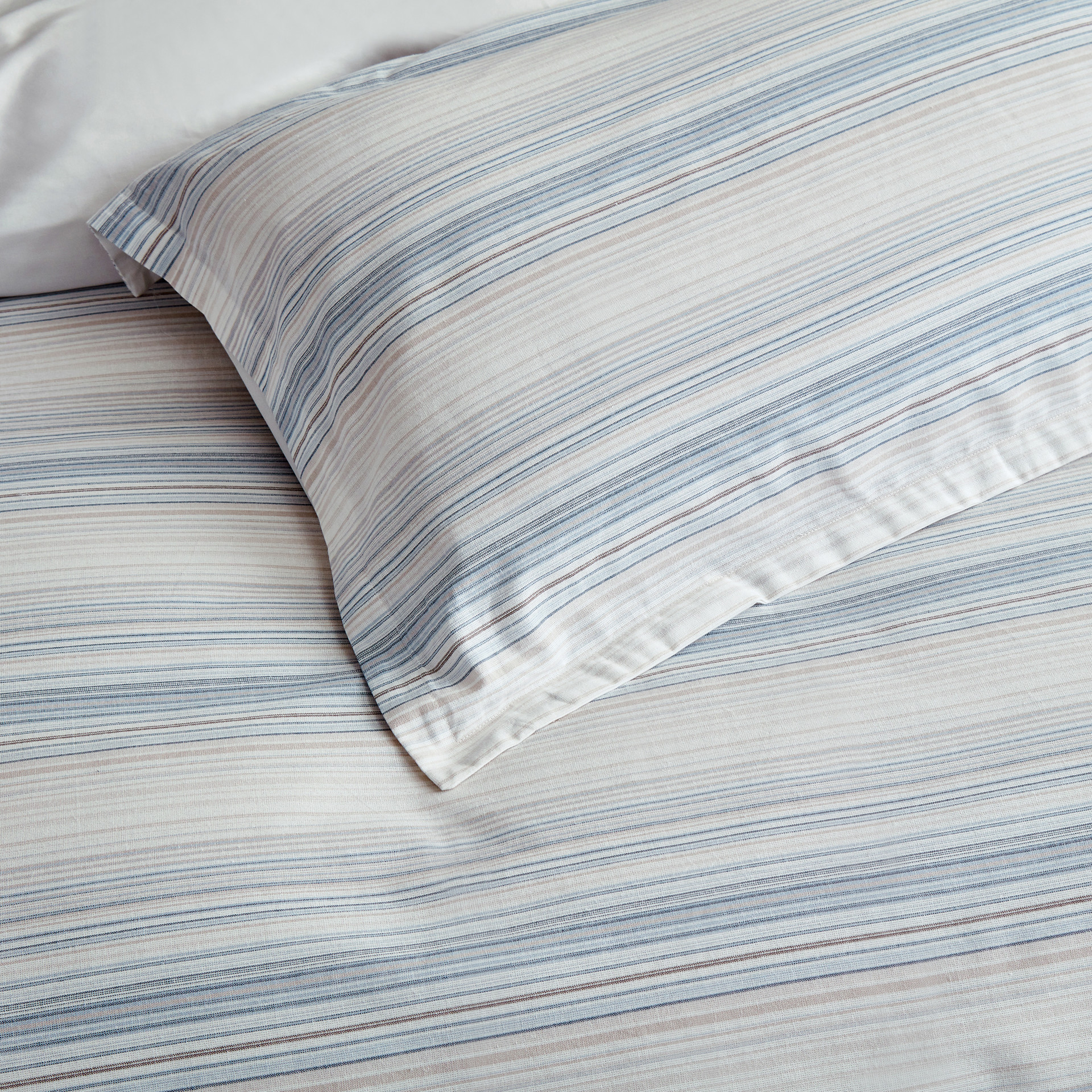 Cet ensemble luxueux composé d'une housse de couette et d'un cache-oreiller présente un motif rayé sophistiqué avec un fond de couleur naturelle et des rayures subtiles de couleur beige, bleu et marine.