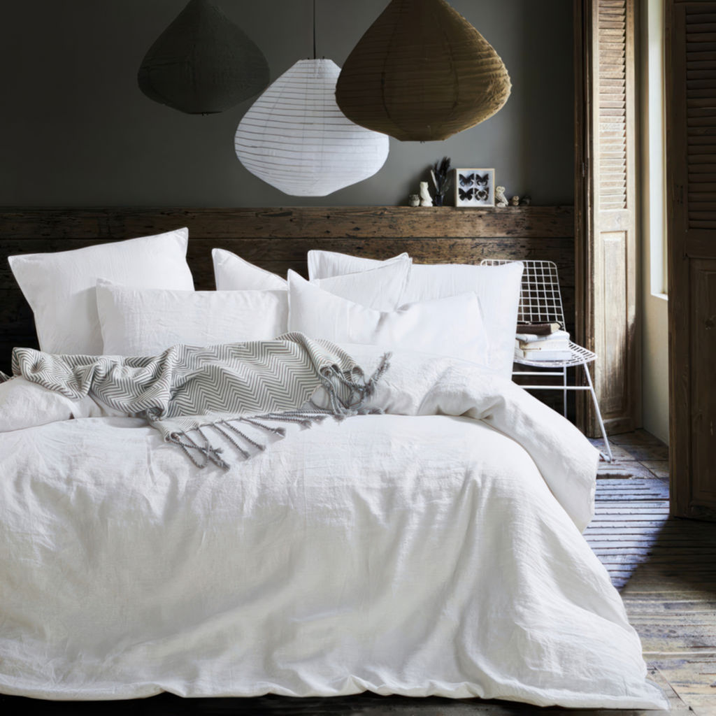L'ensemble de housse de couette en lin blanc frais est la quintessence de l'élégance. Une fermeture à bouton caché au pied de la housse facilite la préparation du lit.